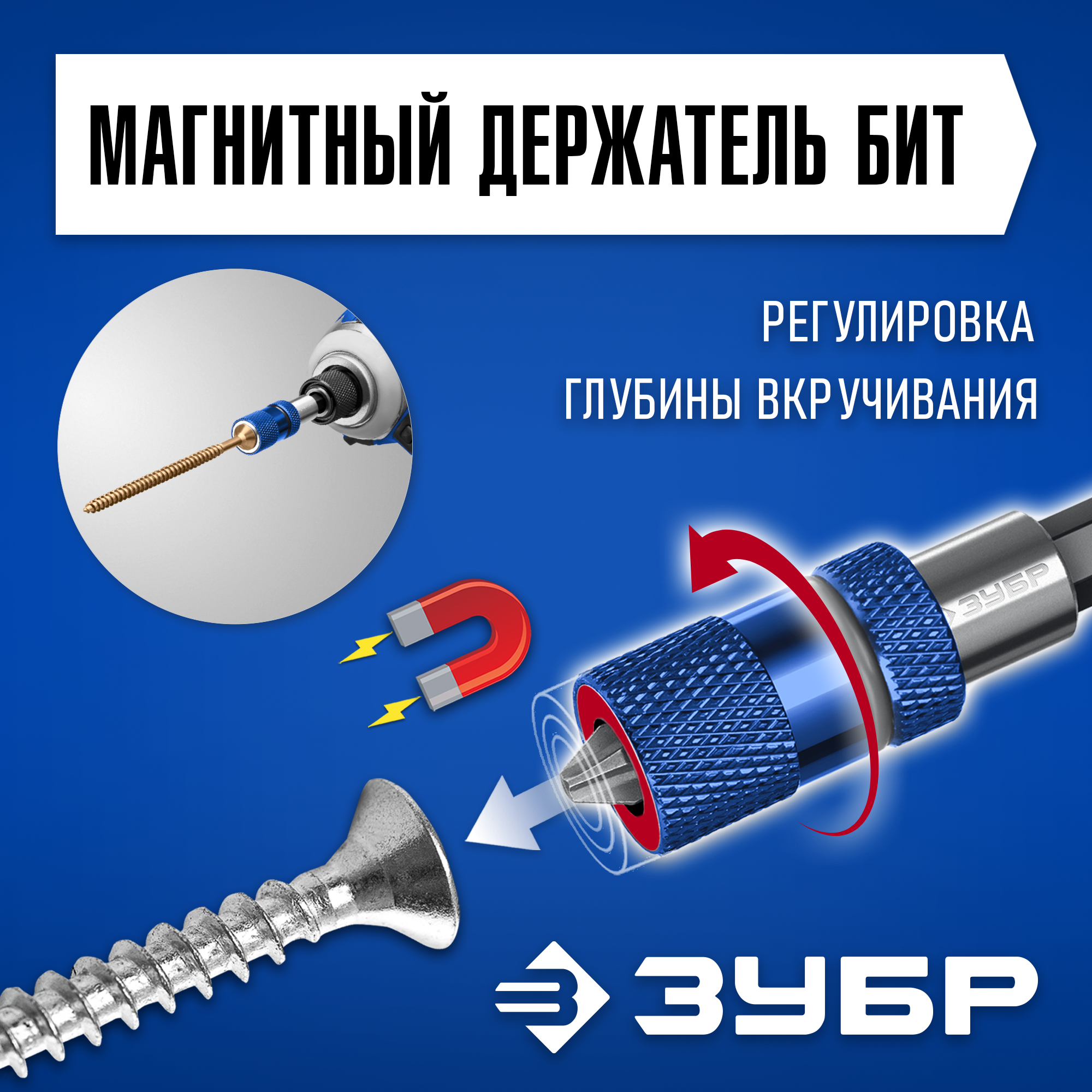 Профессиональный магнитный адаптер с регулируемым ограничителем. Для регулировки глубины вкручивания крепежа и предотвращения повреждения поверхностей из гипсокартона и дерева.