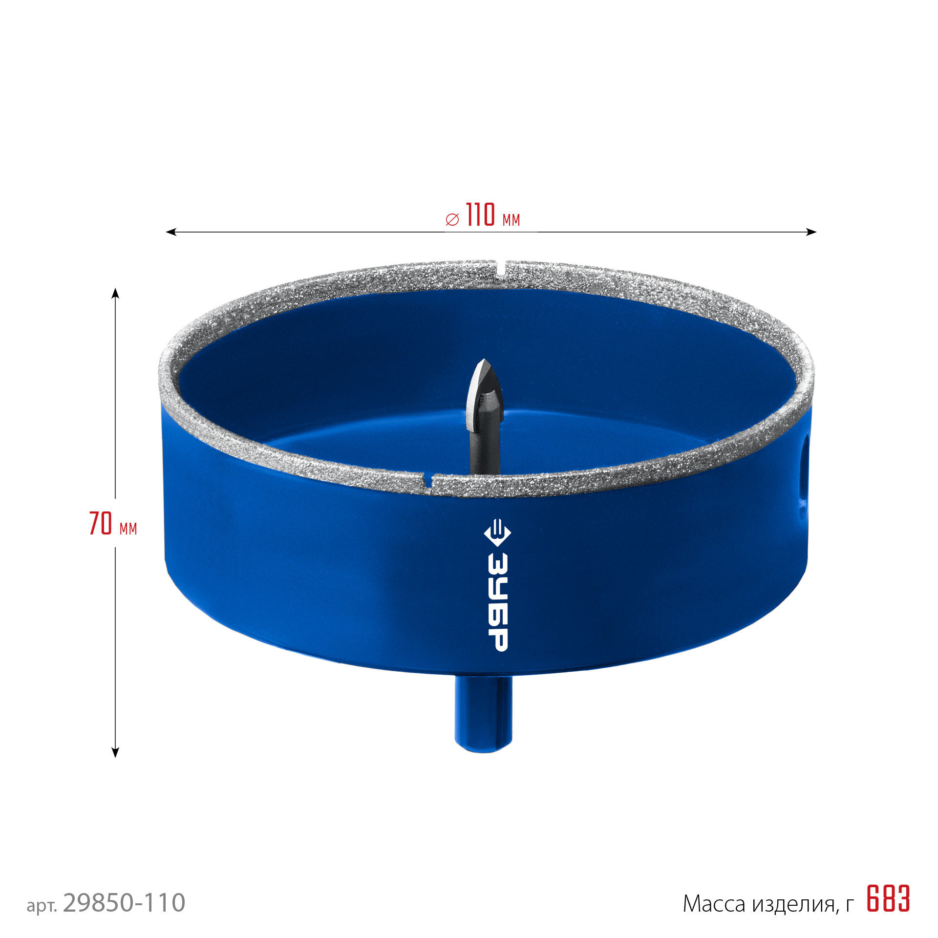ЗУБР АГК d 110 мм (центр. сверло, трехгр. хвост, Р60), Алмазная коронка, Профессионал (29850-110)