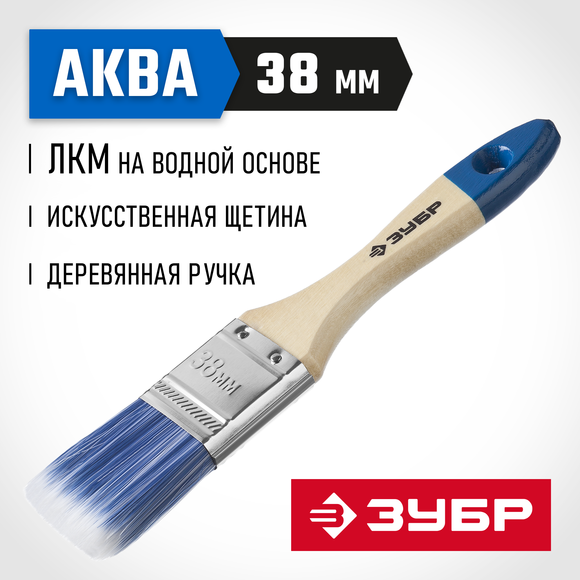 ЗУБР АКВА, 38 мм, 1.5″, светлая искусственная щетина, деревянная ручка, для воднодисперсионных и акриловых ЛКМ, плоская кисть (4-01007-038)