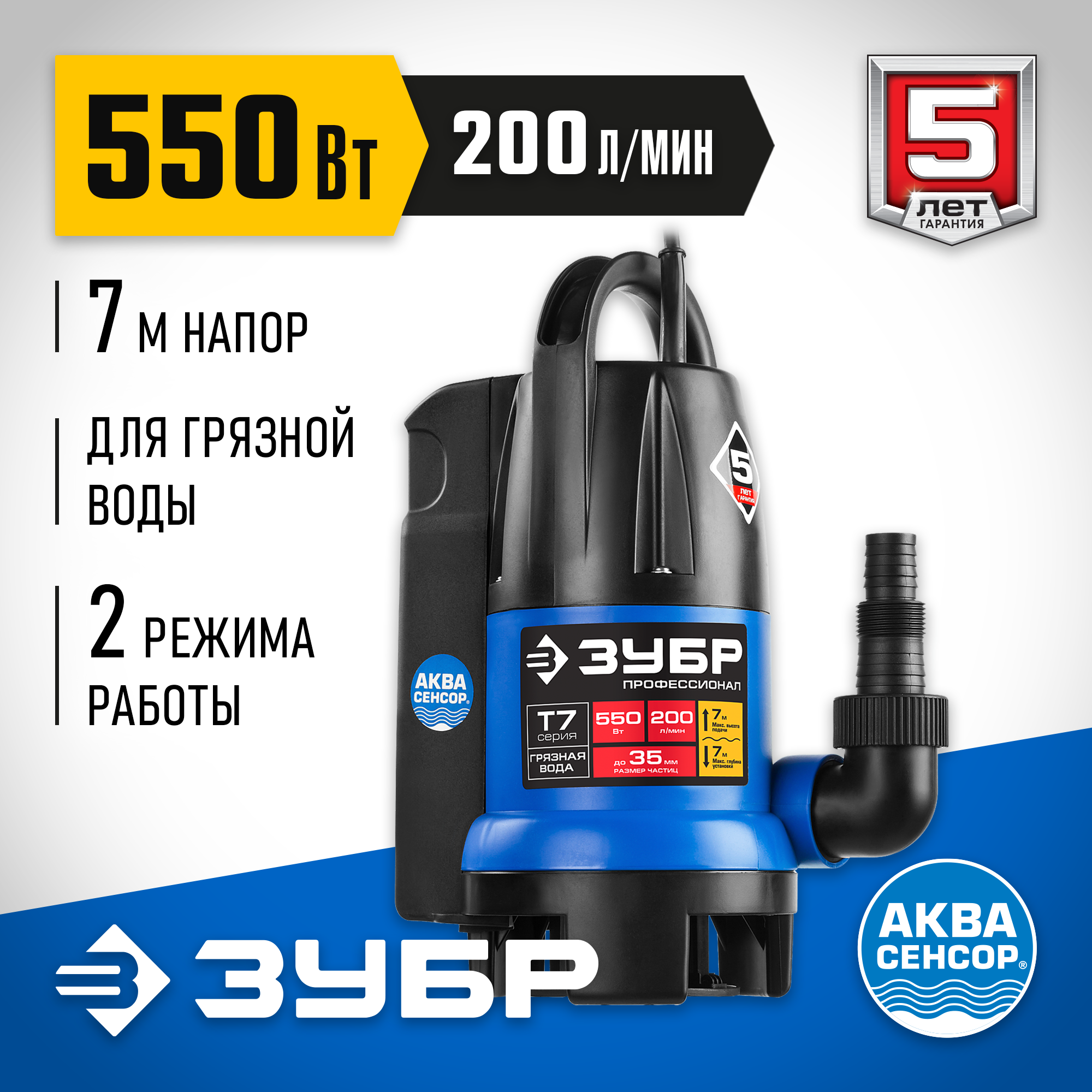 Дренажный насос для грязной воды, ЗУБР АкваСенсор 550 Вт, Профессионал (НПГ-Т7-550)