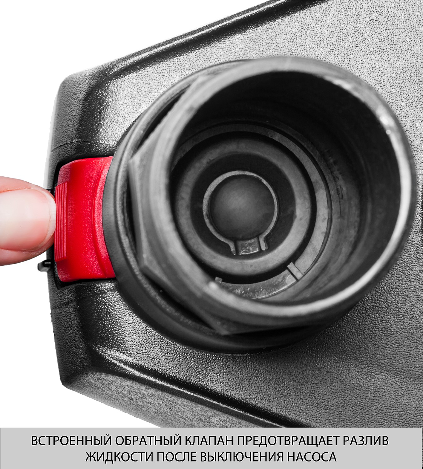 - Встроенный обратный клапан предотвращает разлив жидкости после выключения насоса и сокращает время всасывания при повторном запуске