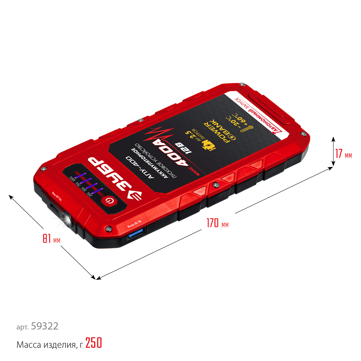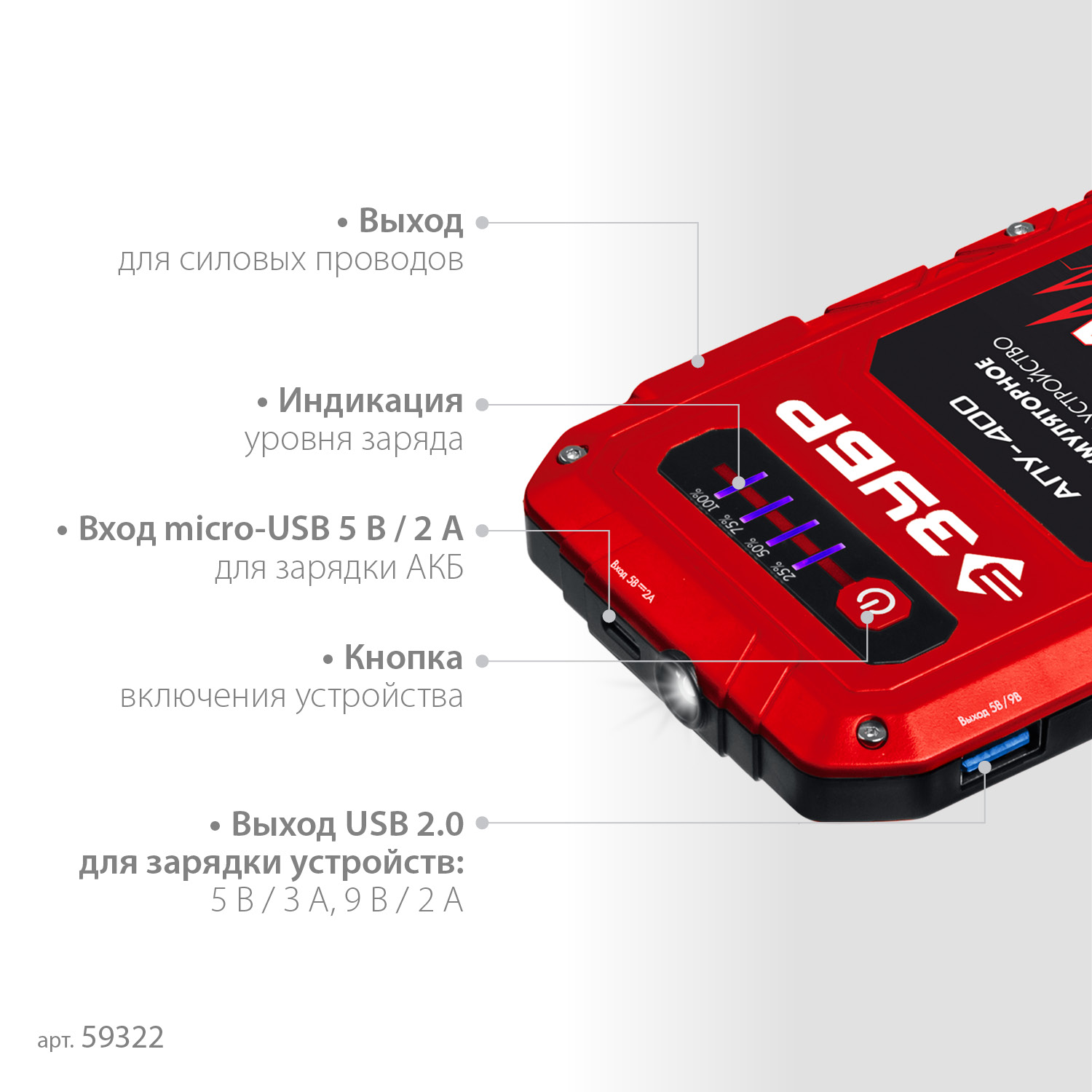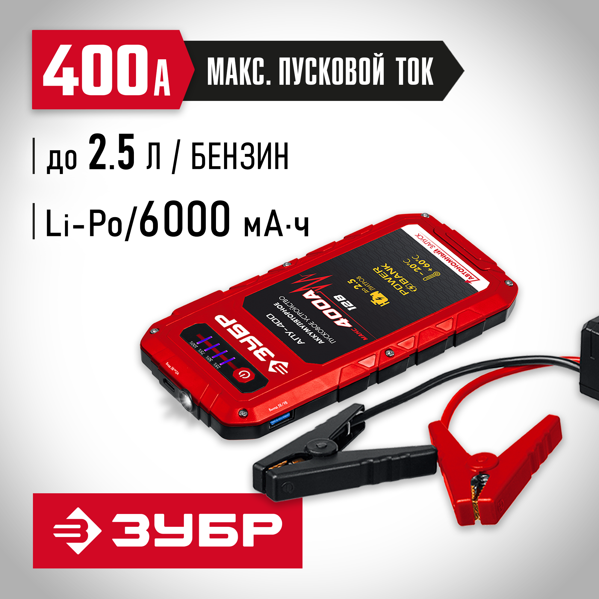 Специальное пуско-зарядное устройство с литий-полимерными аккумуляторами, для аварийного запуска двигателя транспортного средства в случае неисправной АКБ. Устройство подходит для любых типов транспортных средств с напряжением бортовой сети 12В, а также служит для подзарядки и работы широкого ряда мобильной техники и электроники от встроенных разъемов USB 5В. Рекомендовано для любых типов транспортных средств бензиновыми двигателями до 2500 см. куб.