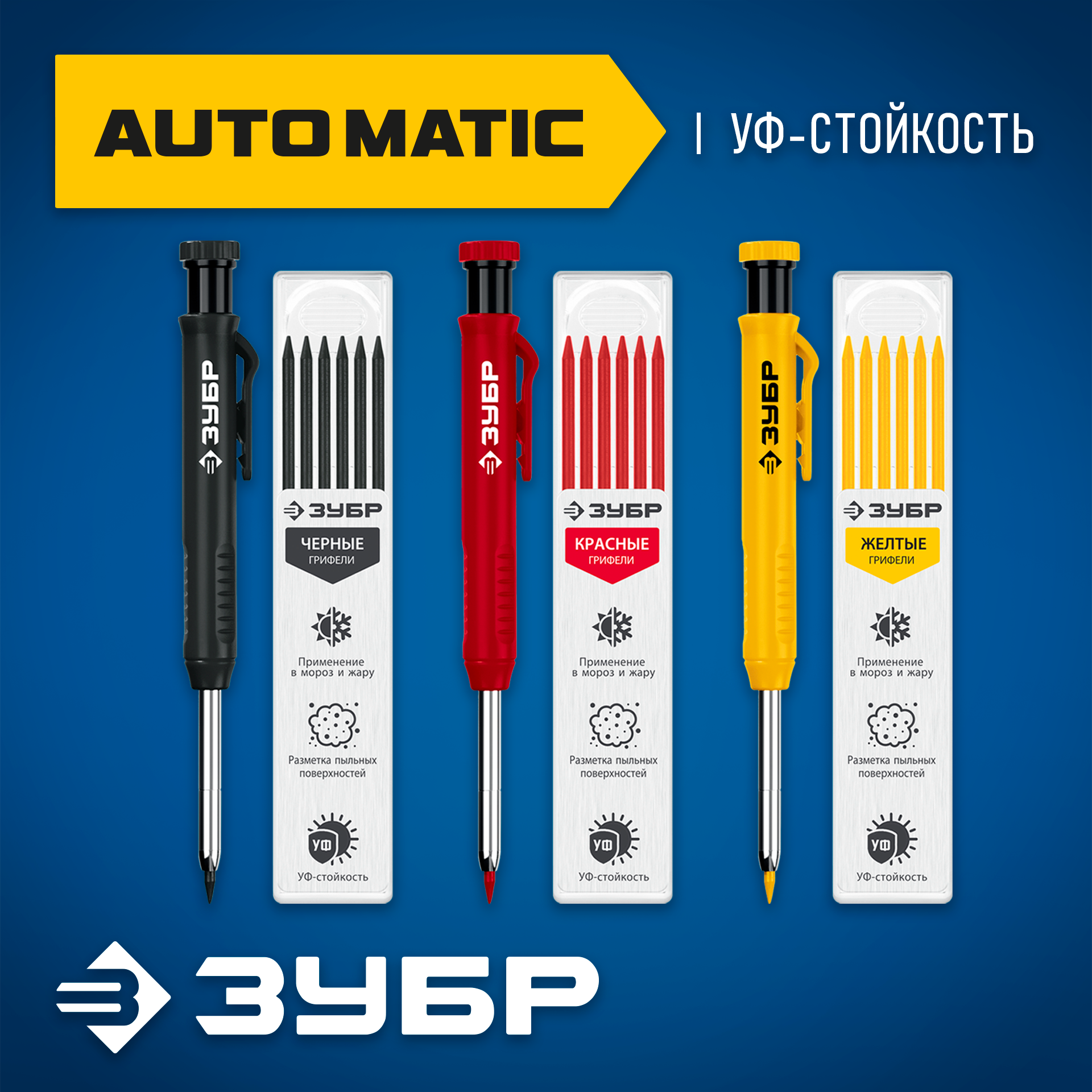 Автоматический строительный карандаш подходит для нанесения разметки на большинство материалов. Не выгорает на солнце, устойчив к температурным перепадам. Безопасен для человека и окружающей среды, т.к. не содержит токсических веществ.