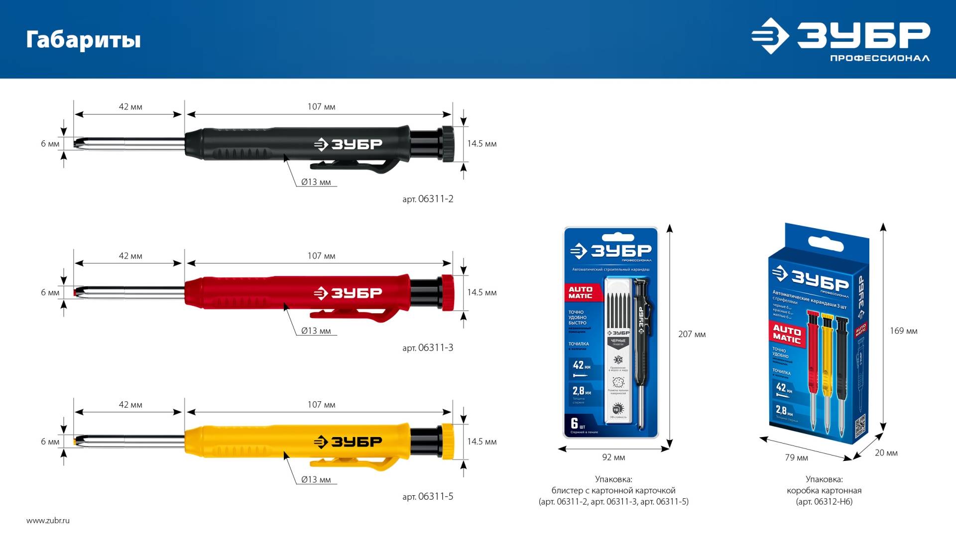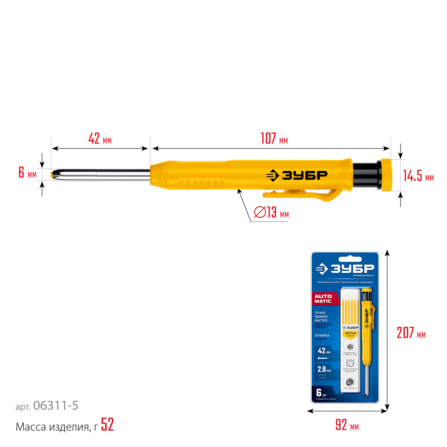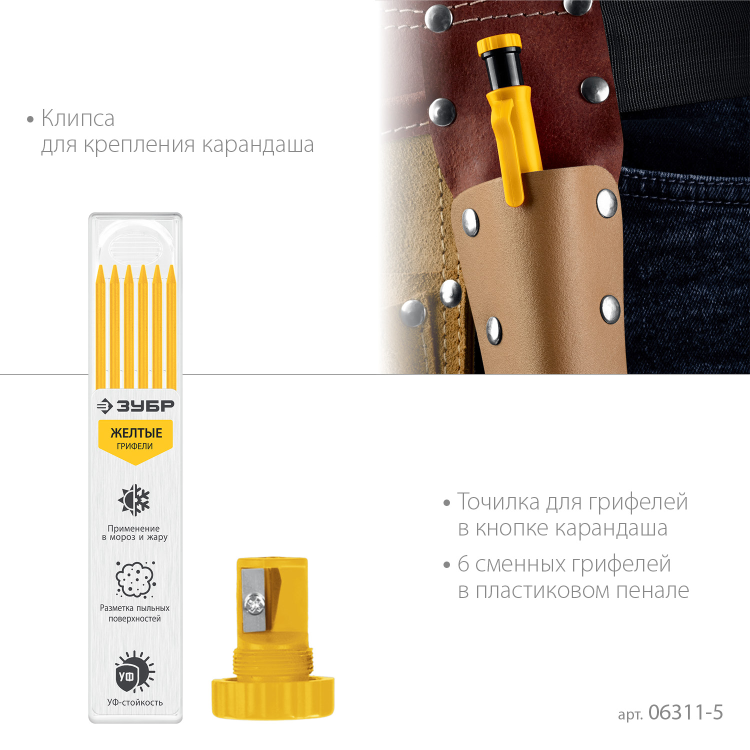 Автоматический строительный карандаш подходит для нанесения разметки на большинство материалов. Не выгорает на солнце, устойчив к температурным перепадам. Безопасен для человека и окружающей среды, т.к. не содержит токсических веществ.