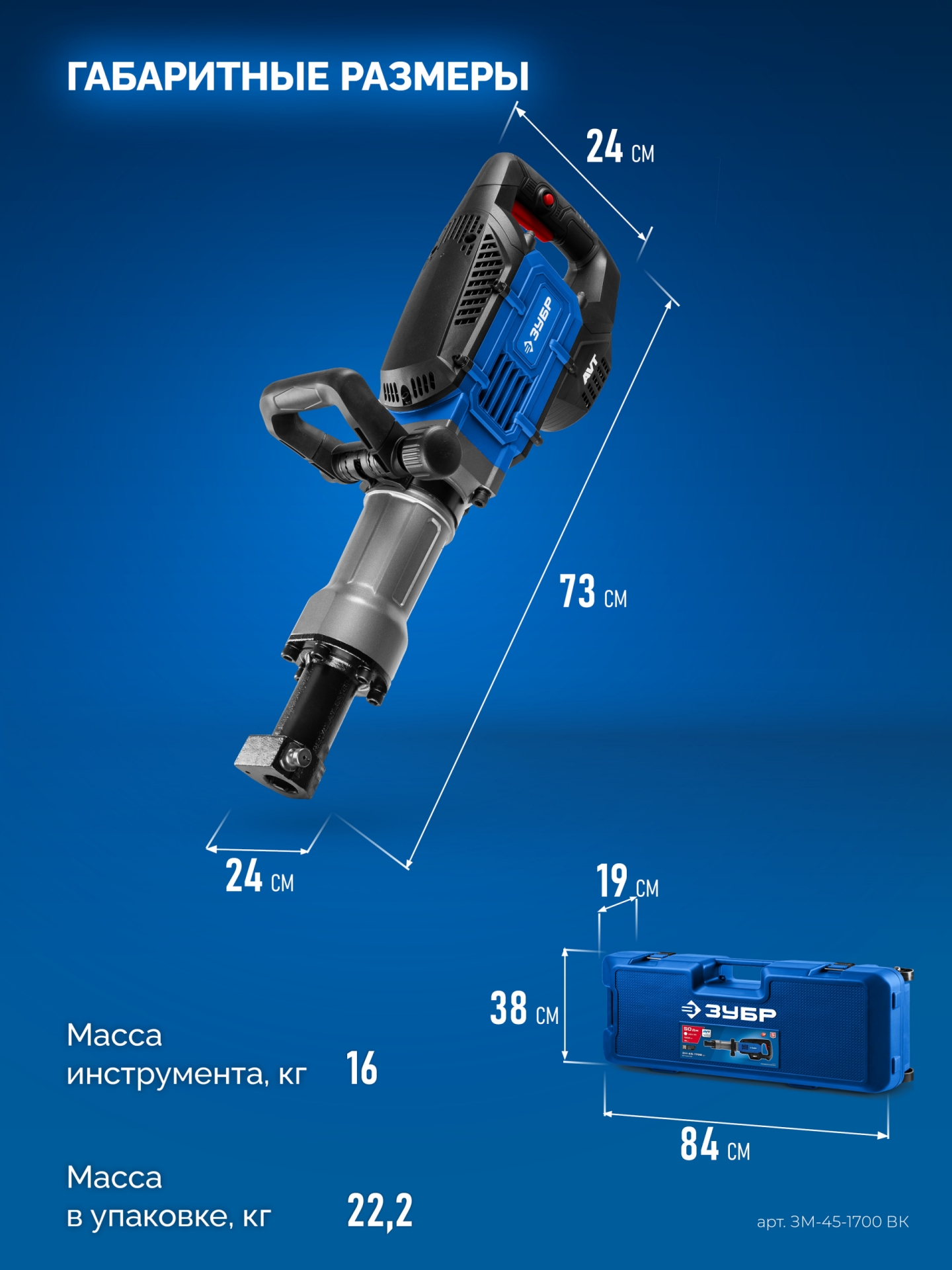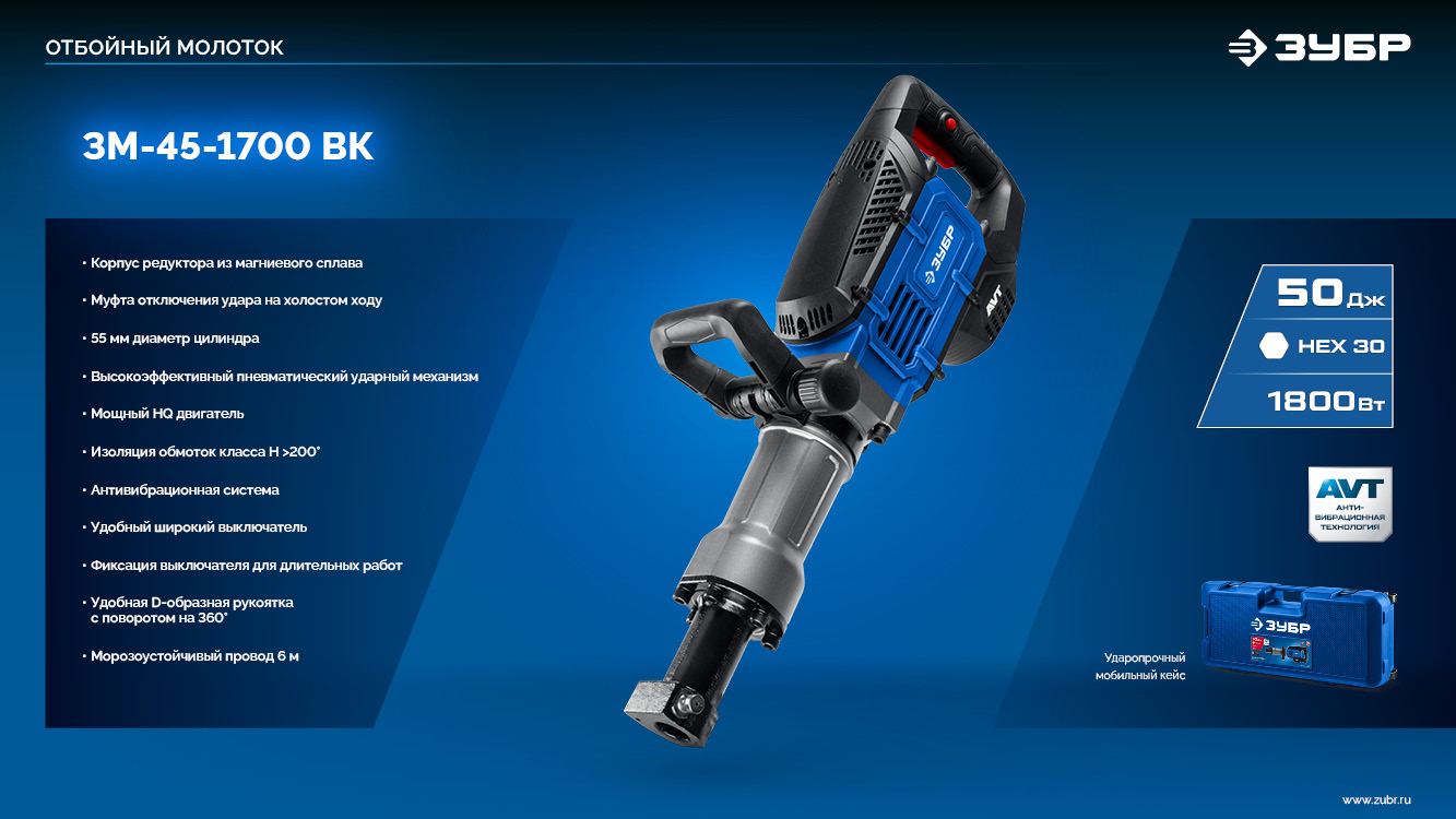 Мощный инструмент для ударного разрушения различных конструкций. Металлический корпус из магниевого сплава, значительная энергия удара 50 Дж, активная антивибрационная система, надёжный патрон HEX 30 делают отбойный молоток незаменимым помощником в Вашей работе.