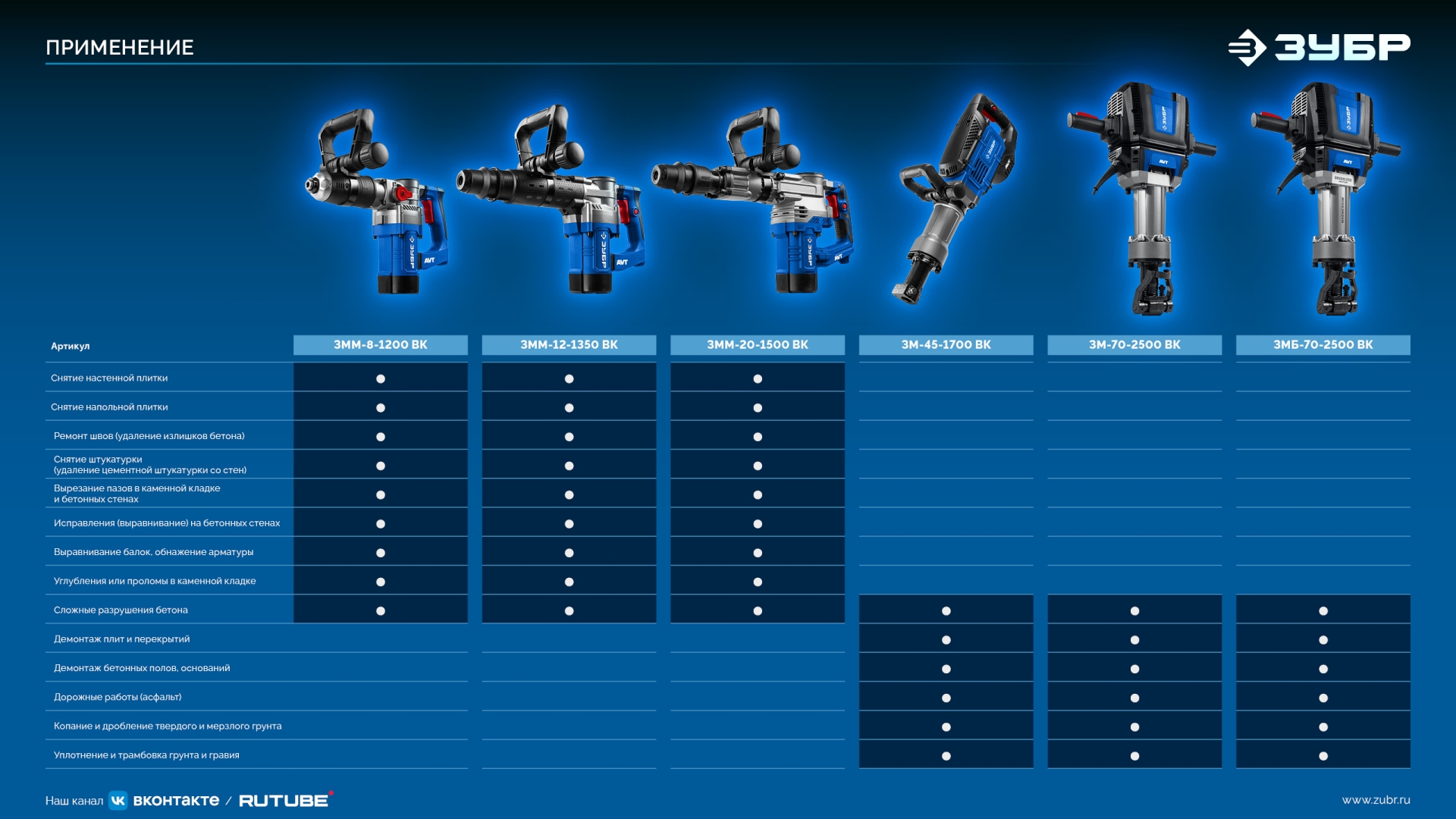 Для разрушения конструкций из бетона, железобетона, кирпича и камня, дробления асфальтовых, бетонных и плиточных покрытий, разрыхления твердого, скального, промерзшего грунта, а также для уплотнения и трамбовки грунта, раскалывания льда, дров, забивания цилиндрических стержней и других строительных работ