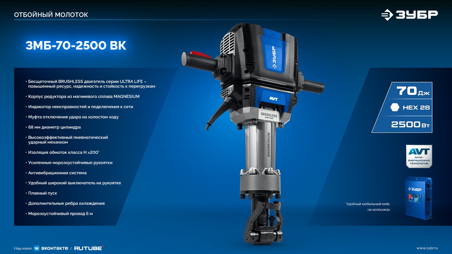 Мощный представитель среди инструментов на рынке с энергией удара 70 Дж и бесщёточным мотором. Подходит для разрушения конструкций любого типа. Длинный провод 6 метров, эргономичный двуручный хват и антивибрационная система позволяют надежно удерживать инструмент, а значительный вес инструмента сам создает необходимое давящее усилие для продуктивной работы