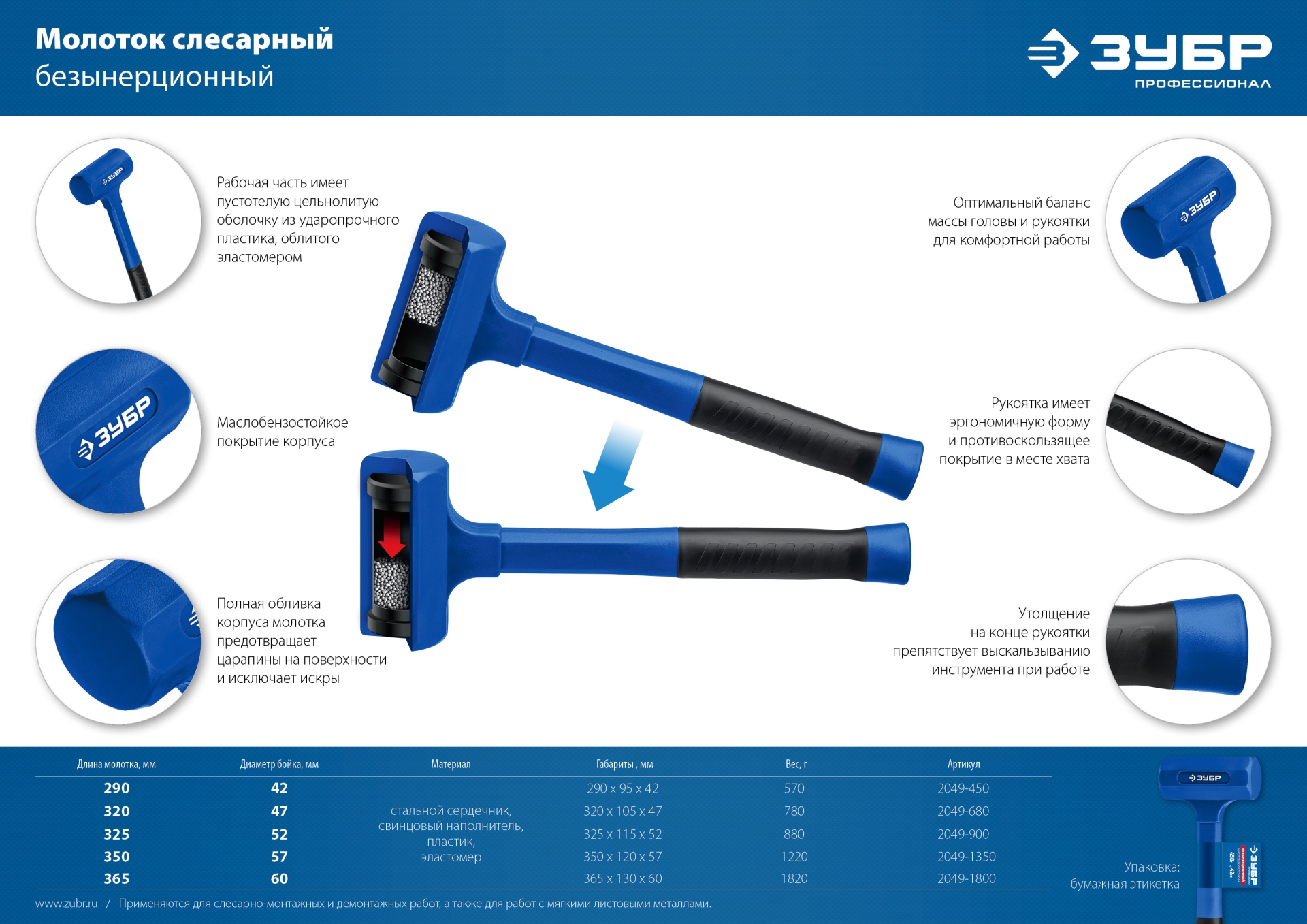 ЗУБР БМО, 47 мм, 680 г, безынерционный молоток, Профессионал (2049-680)