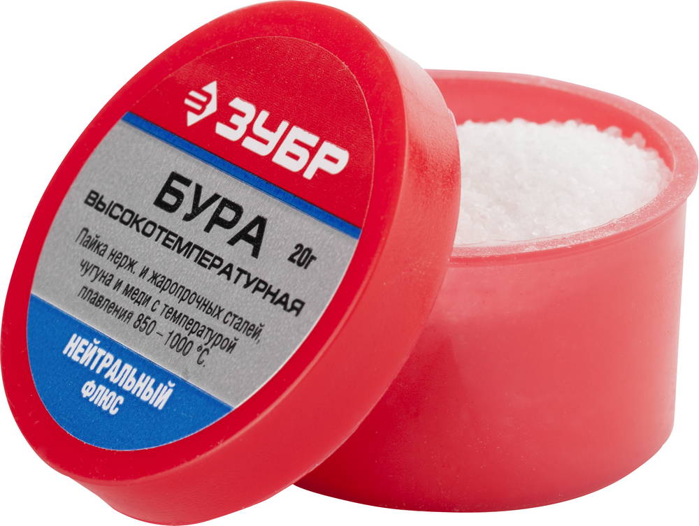 Флюс Бура Зубр 55476-020 применяется для пайки обычных металлов с благородными (золото, серебро, мельхиор). В расплавленном состоянии способен растворять оксиды металлов. Требует промывки горячей водой.