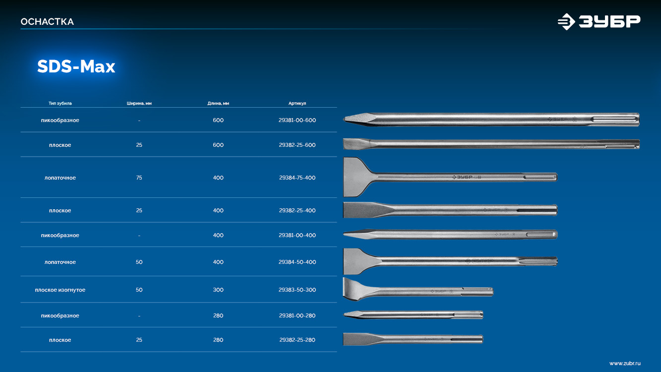 Зубила ЗУБР SDS-max - ударный инструмент высокого качества и надежности обладающий высокой стойкостью к любым нагрузкам.