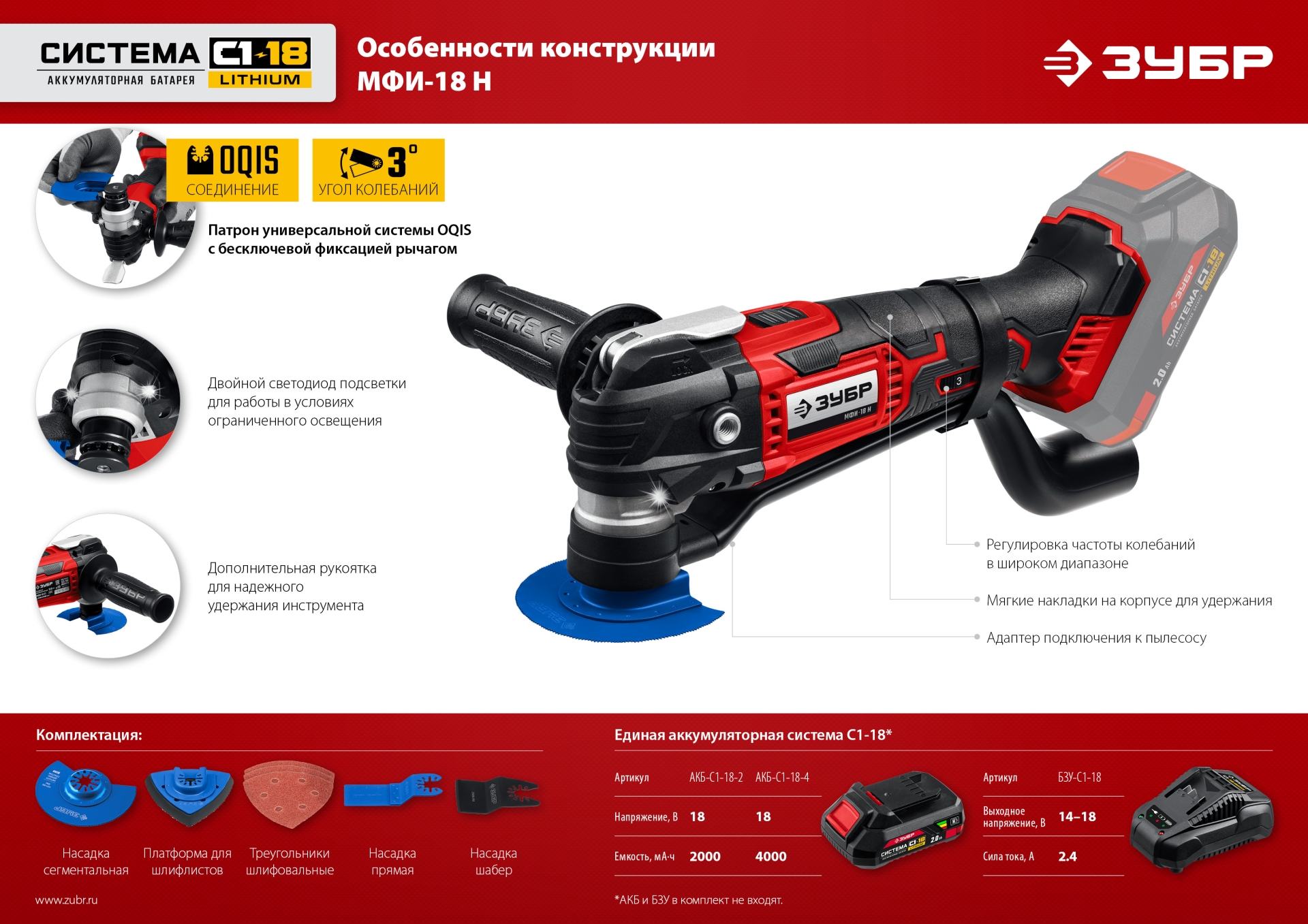 Реноватор аккумуляторный ЗУБР - универсальное устройство для разных строительных работ (резка, шлифование), особенно в труднодоступных местах и в отсутствие доступа к электричеству. Большой угол колебаний 3 градуса в сочетании с широким спектром регулировки частоты обеспечивают эффективную работу с любым материалом. Расширенная комплектация включает в себя базовый набор насадок для начала работы сразу после покупки