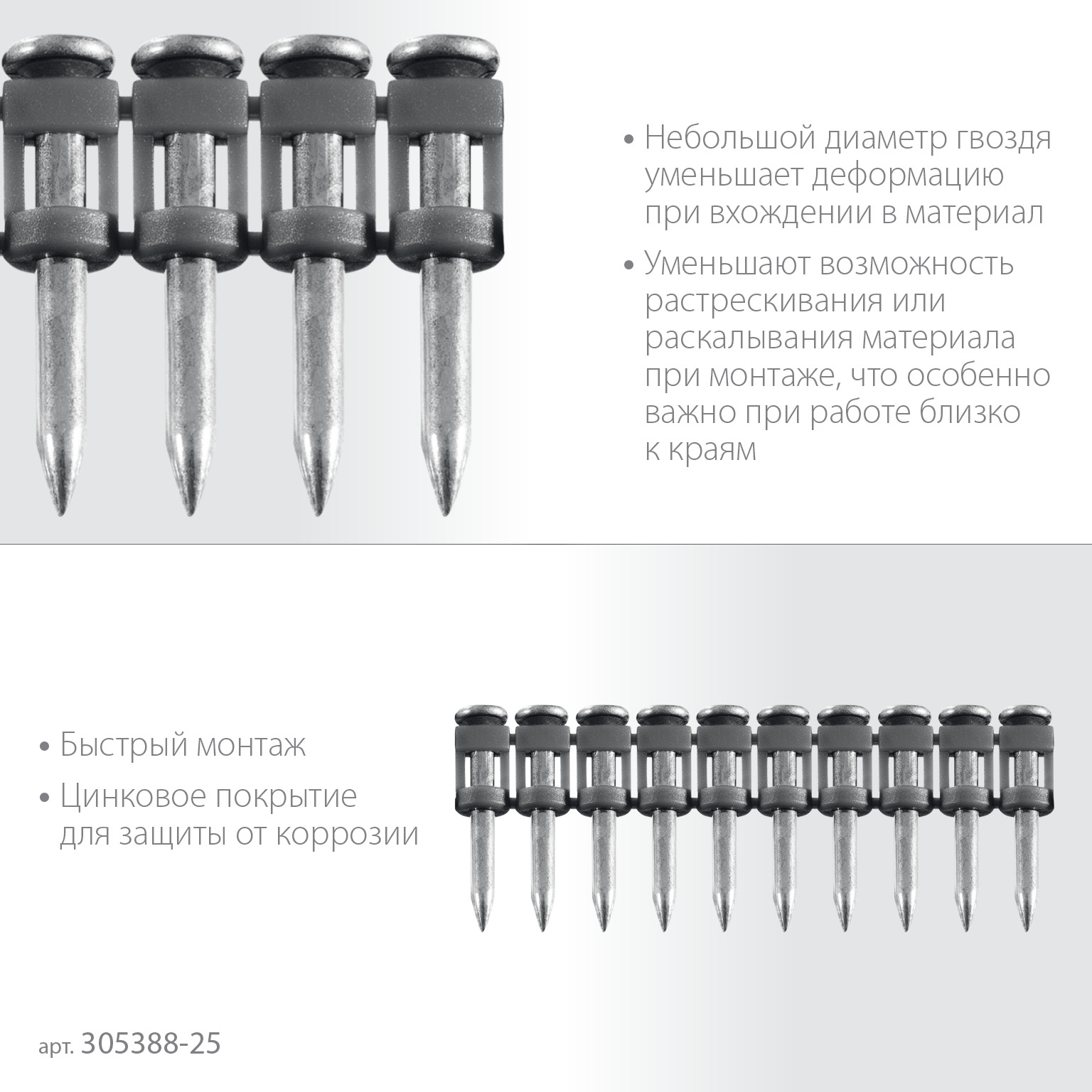 • Быстрый монтаж: гвоздь забивается при помощи гвоздезабивного пистолета (нейлера).