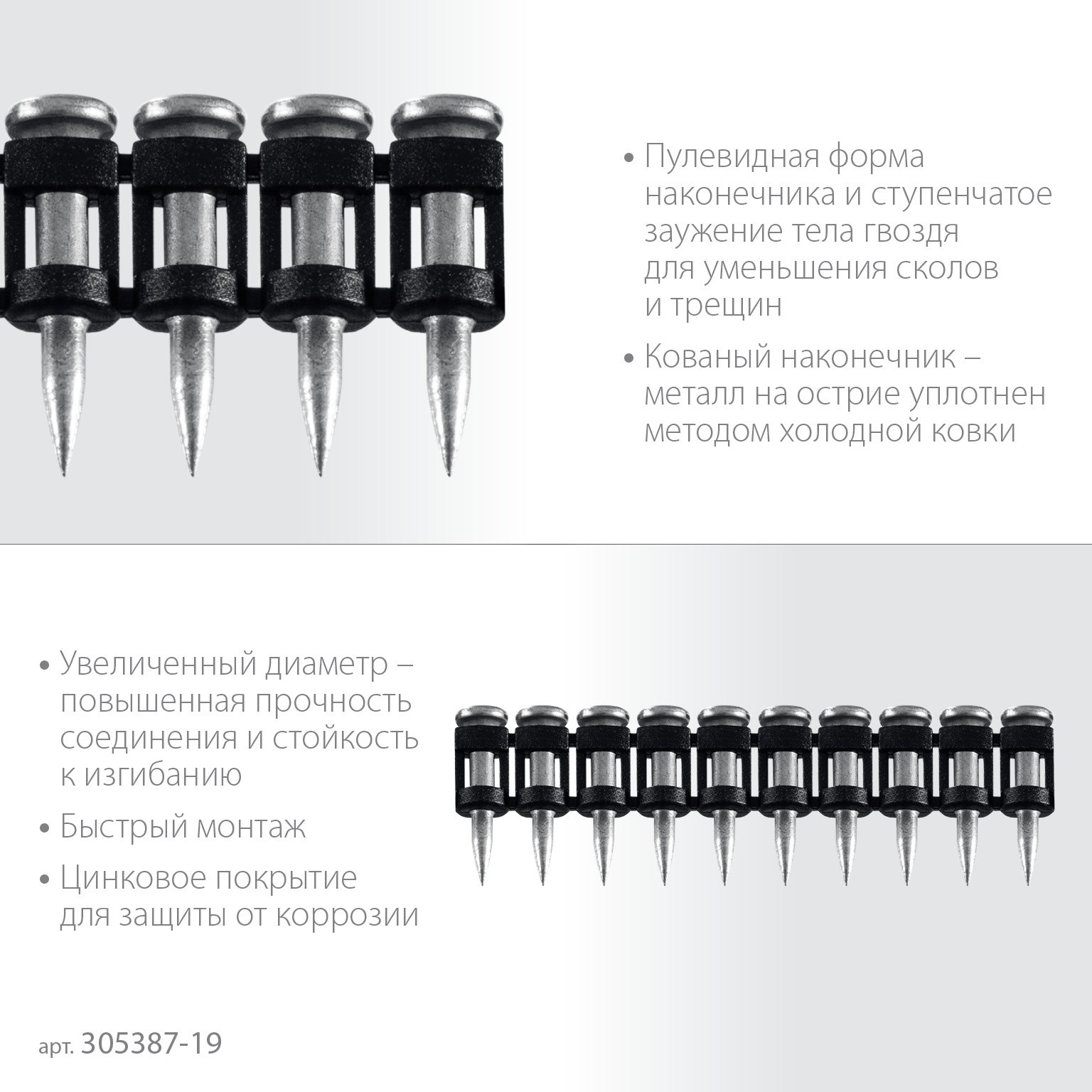 • Пулевидная формы наконечника и ступенчатое заужение тела гвоздя до 2,7 мм повышают качество работ за счет уменьшения сколов и трещин.