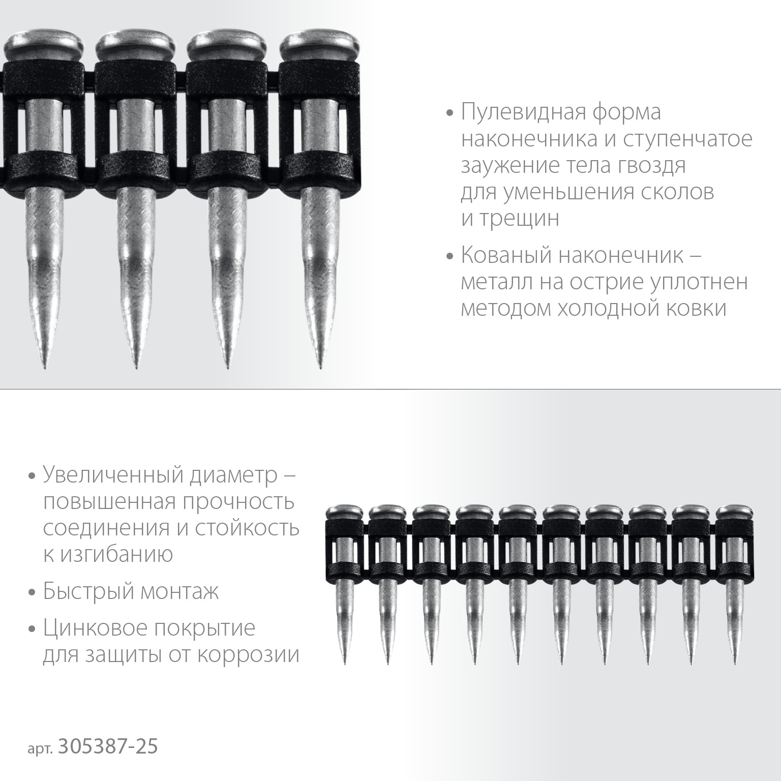 • Металл на острие гвоздя уплотняется в процессе производства методом холодной ковки, что обеспечивает увеличенную скорость и легкость монтажа. Это особенно важно при попадании гвоздя в твердые фракции в неоднородных материалах.