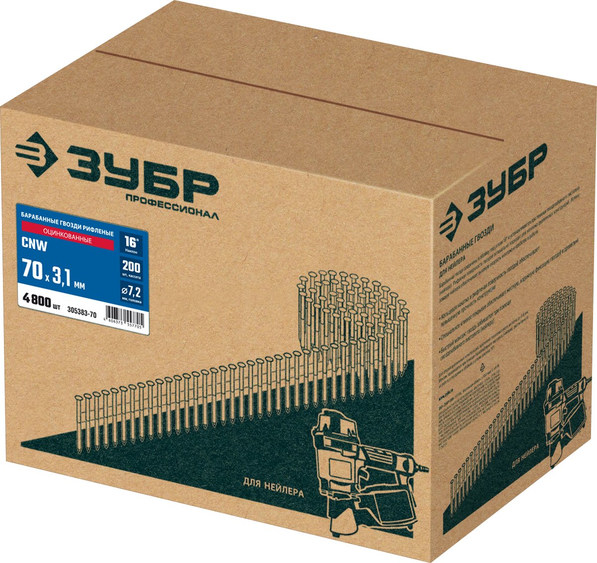 ЗУБР CNW 70 х 3.1 мм, барабанные гвозди рифленые оцинкованные, 4800 шт (305383-70)