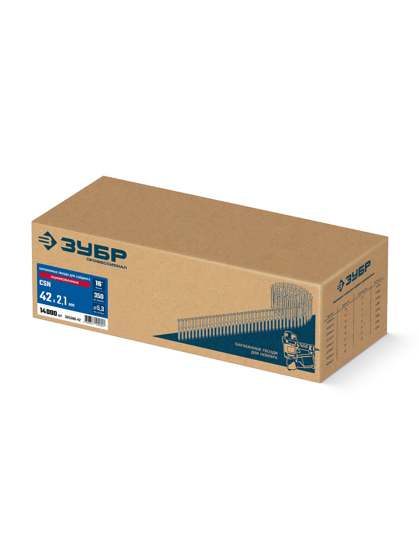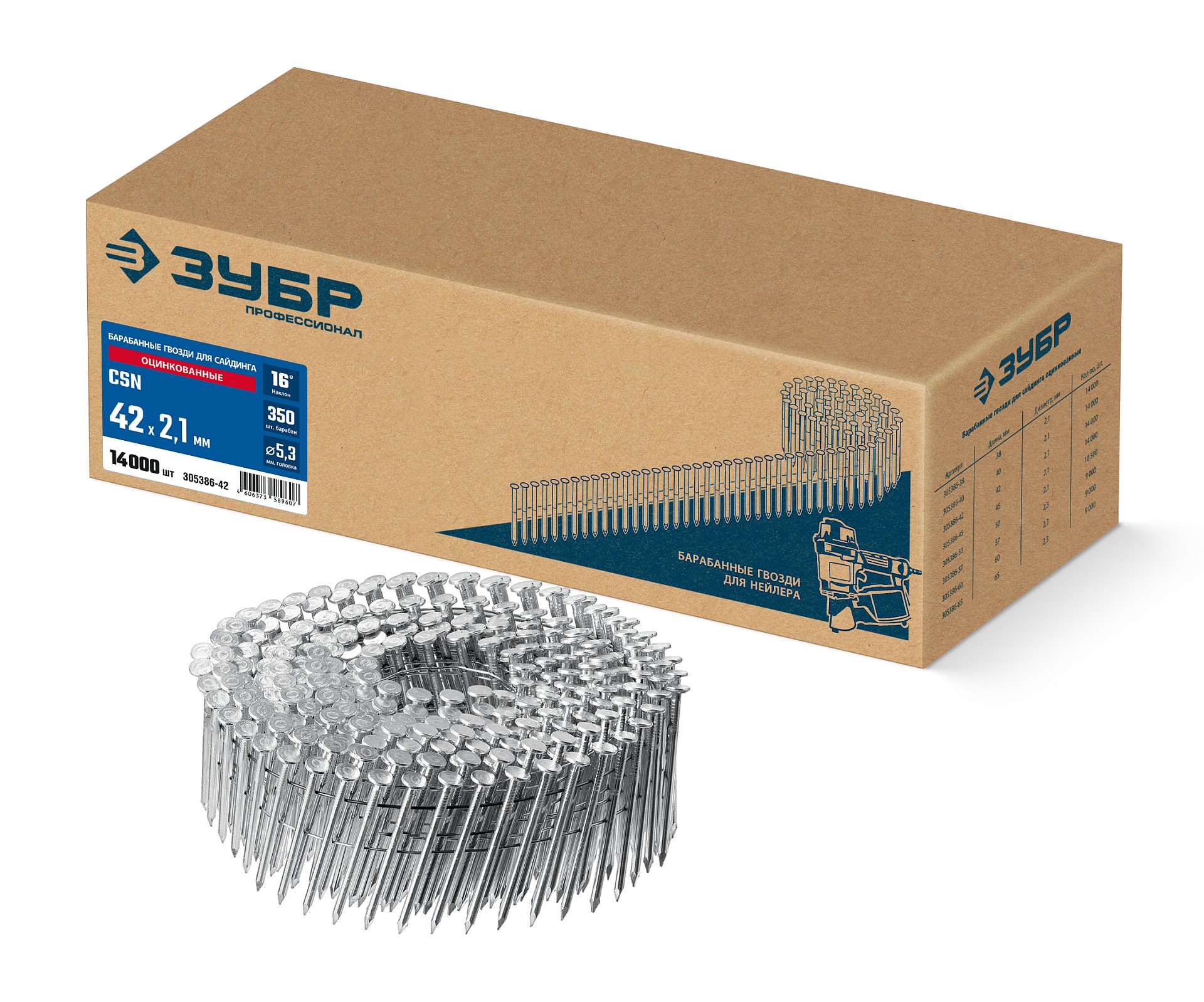 ЗУБР CSN 42 х 2.1 мм, барабанные гвозди для сайдинга оцинкованные, 14000 шт (305386-42)