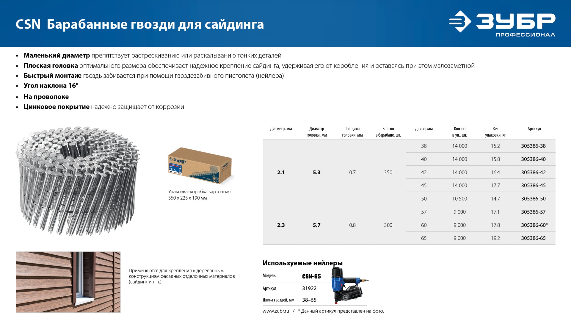 ЗУБР CSN 65 х 2.3 мм, барабанные гвозди для сайдинга оцинкованные, 9000 шт (305386-65)