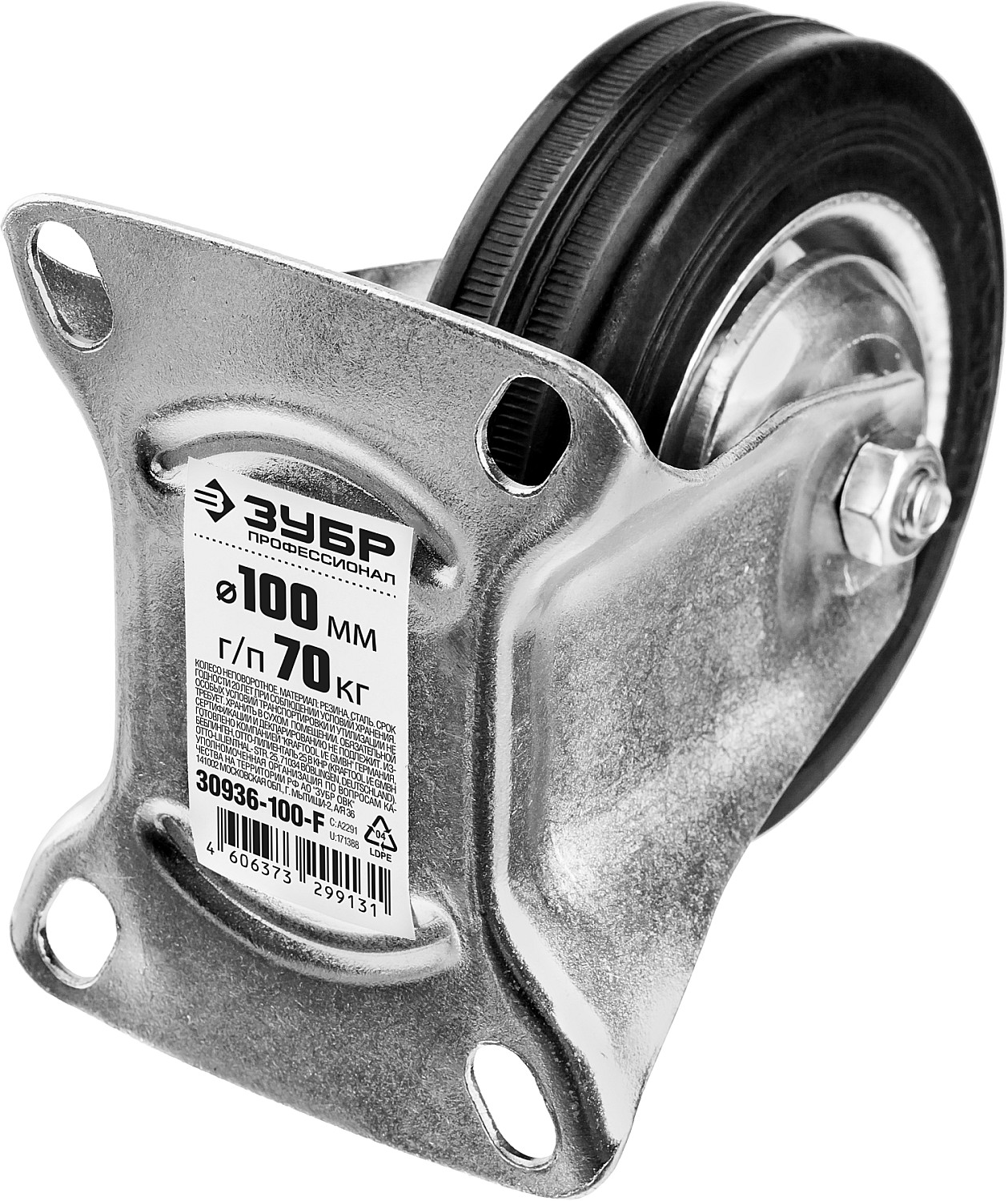 ЗУБР d 100 мм, г/п 70 кг, игольчатый подшипник, резина/металл, неповоротное колесо, Профессионал (30936-100-F)