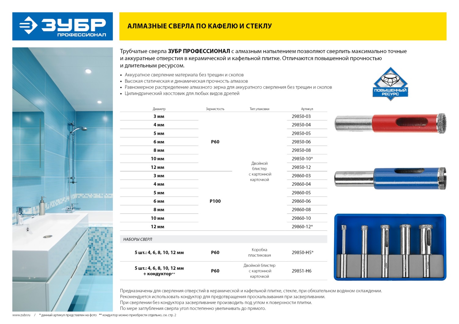 Предназначено для сверления отверстий в керамической и кафельной плитке, стекле, при обязательном водяном охлаждении. Используется с дрелями и шуруповертами в режиме безударного сверления. Рекомендуется работать с помощью направляющего кондуктора.