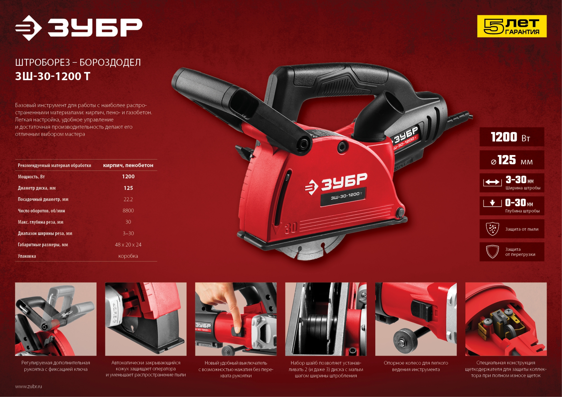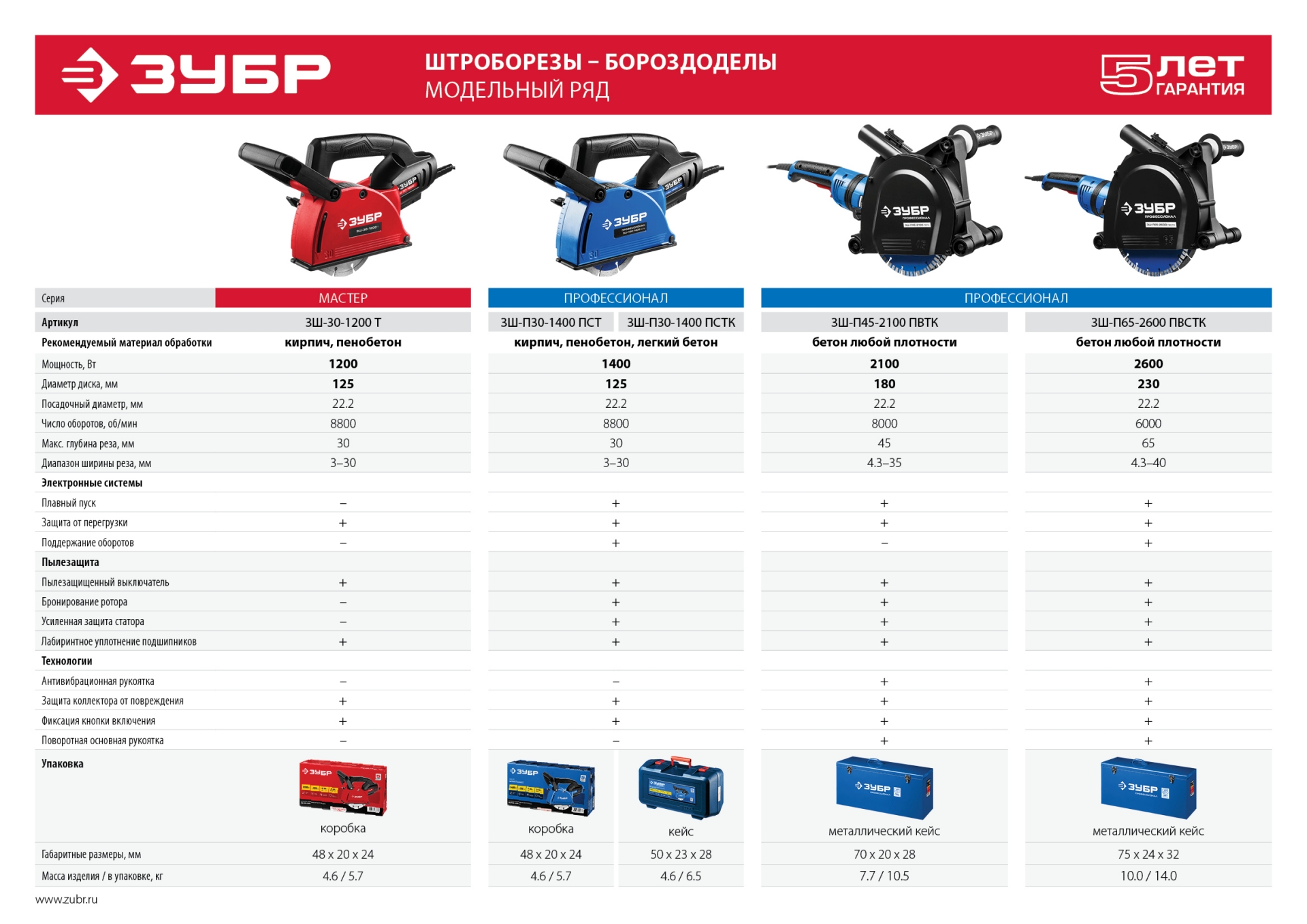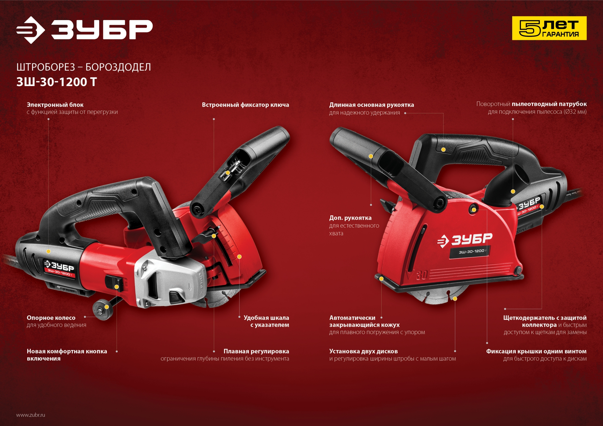 Новинка в линейке штроборезов ЗУБР. Идеально подходит для выполнения штроб в кирпиче, пенобетоне и легком бетоне для прокладки проводки и труб. Мощный двигатель позволяет резать без перегрузки изделия и потери скорости. Надежный хват двумя руками с регулируемой рукояткой и погружная система дисков для удобства работы