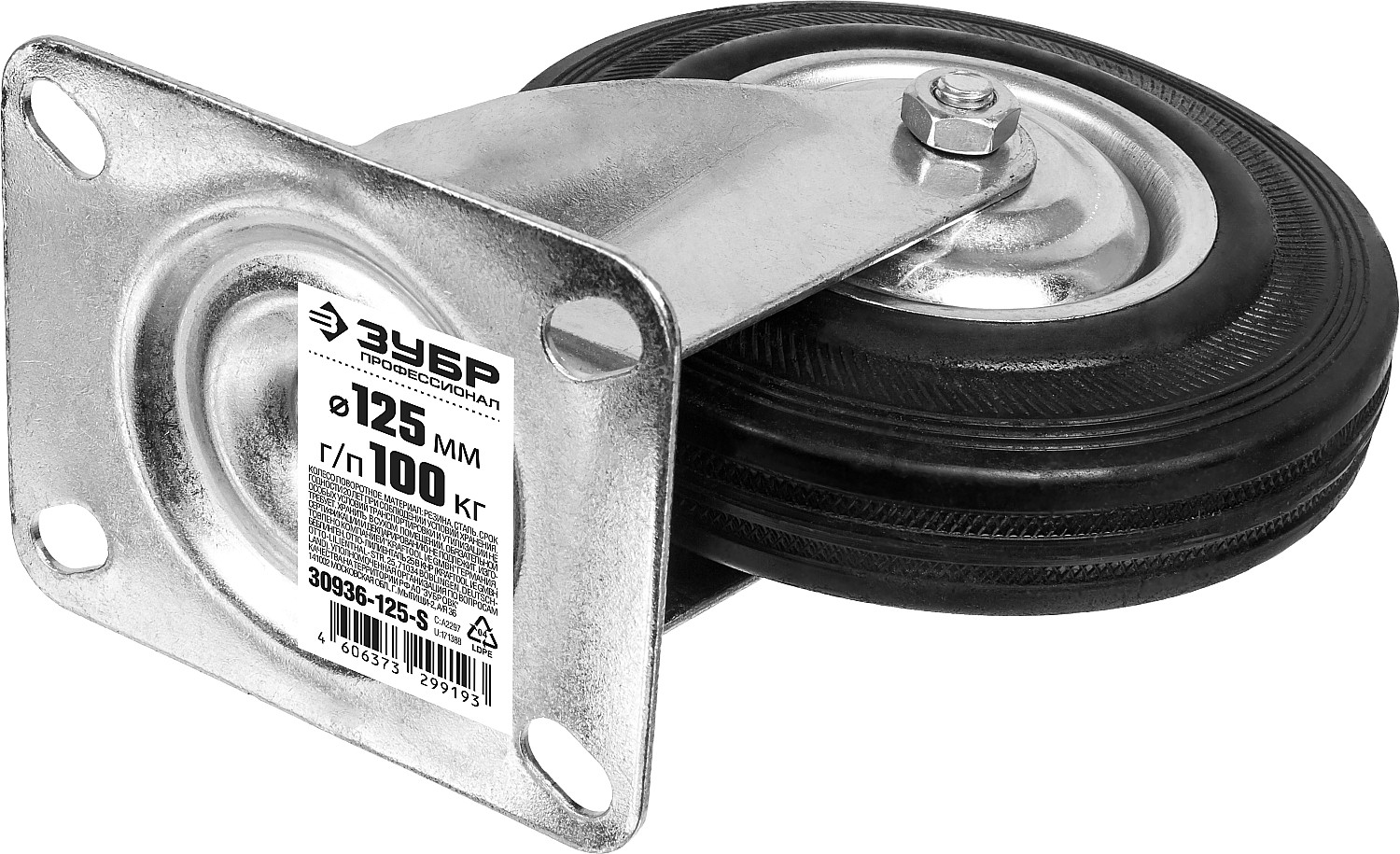 ЗУБР d 125 мм, г/п 100 кг, игольчатый подшипник, резина/металл, поворотное колесо, Профессионал (30936-125-S)