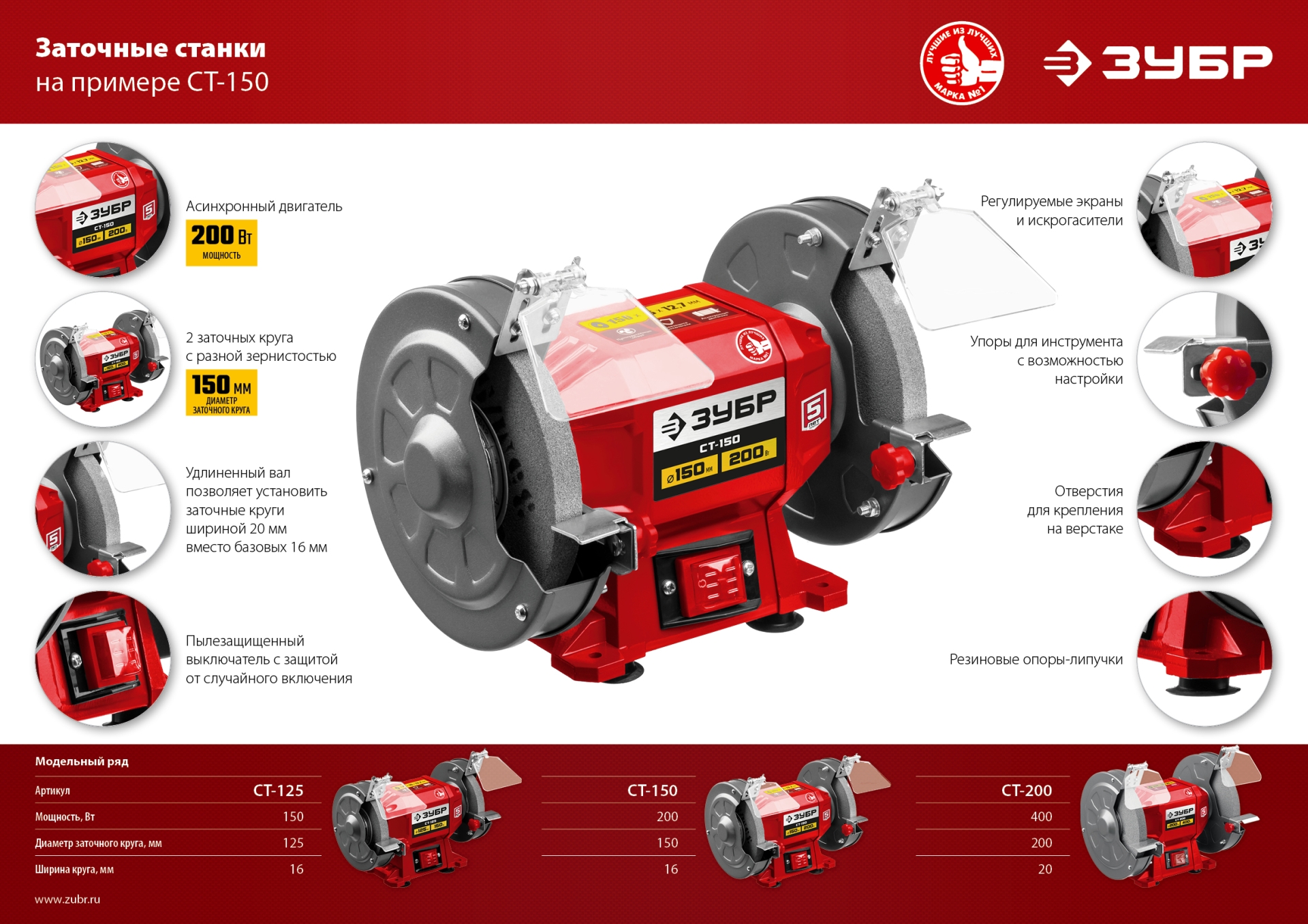 Станок заточной ЗУБР СТ-150 – незаменимый инструмент для гаража, мастерской и используемый для заточки и сухой шлифовки металлических заготовок и режущего инструмента. Простота конструкции, высокая надежность, компактный размер, два камня с разной зернистостью – все что нужно для настоящего мастера, ценяще-го качество и рассчитывающего на долгий срок службы