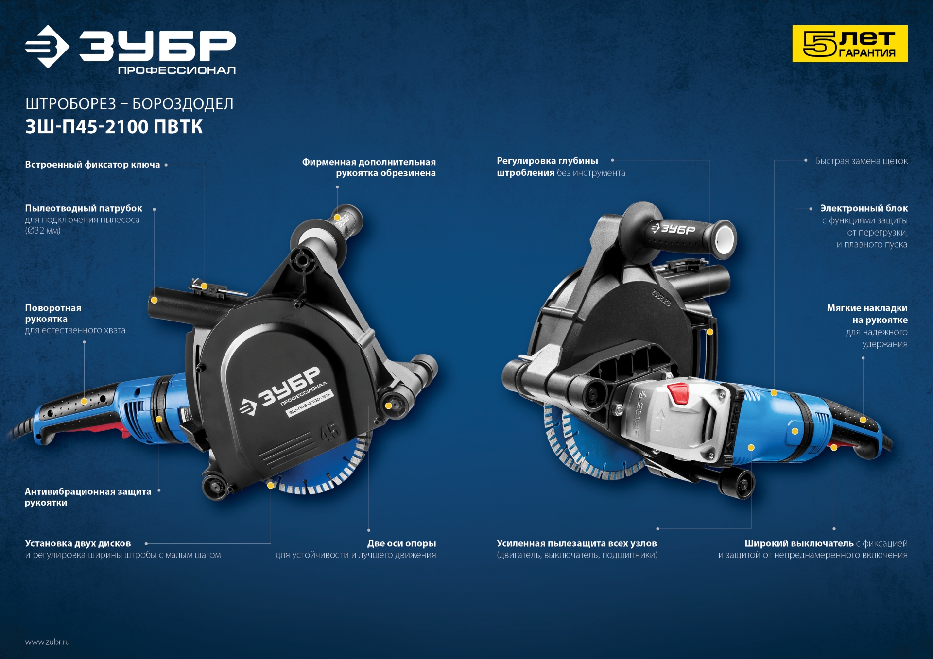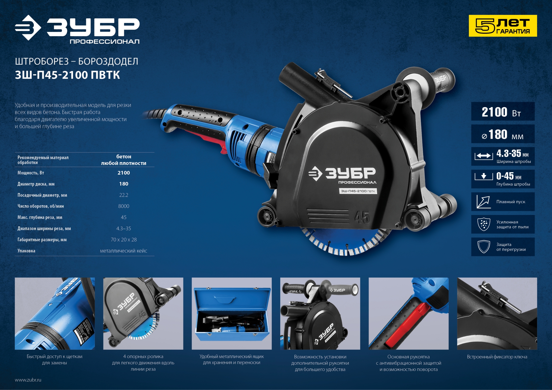Мощная модель в серии профессиональных штроборезов ЗУБР для выполнения штроб в бетонах разных марок. Быстрый рез на любую глубину до 45 мм благодаря увеличенной мощности двигателя. Эффективное пылеудаление исключает простои на проветривание пыли. Пониженный уровень вибраций в условиях предельных нагрузок за счет точной сборки и демпфированной основной рукоятки