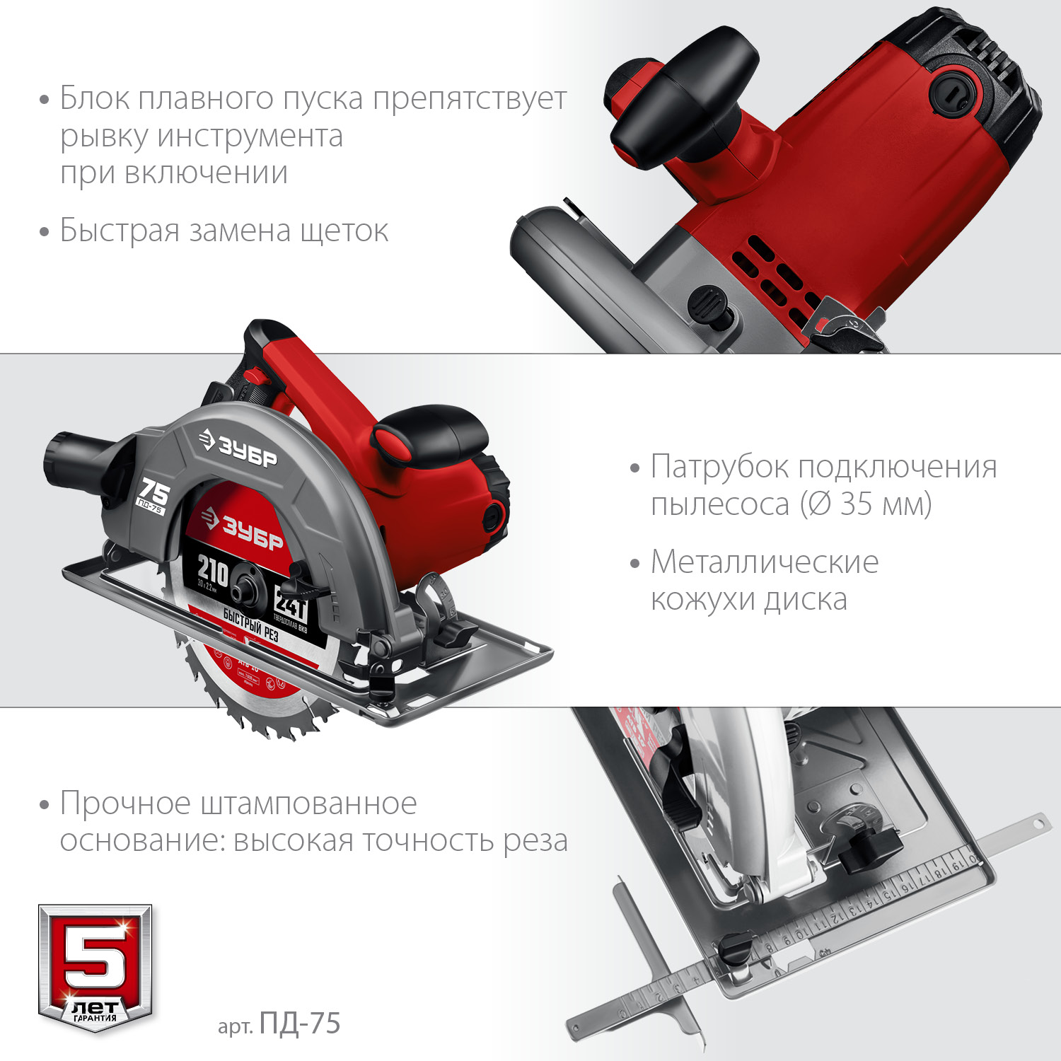 - Бесступенчатая регулировка глубины и угла пиления для точных работ