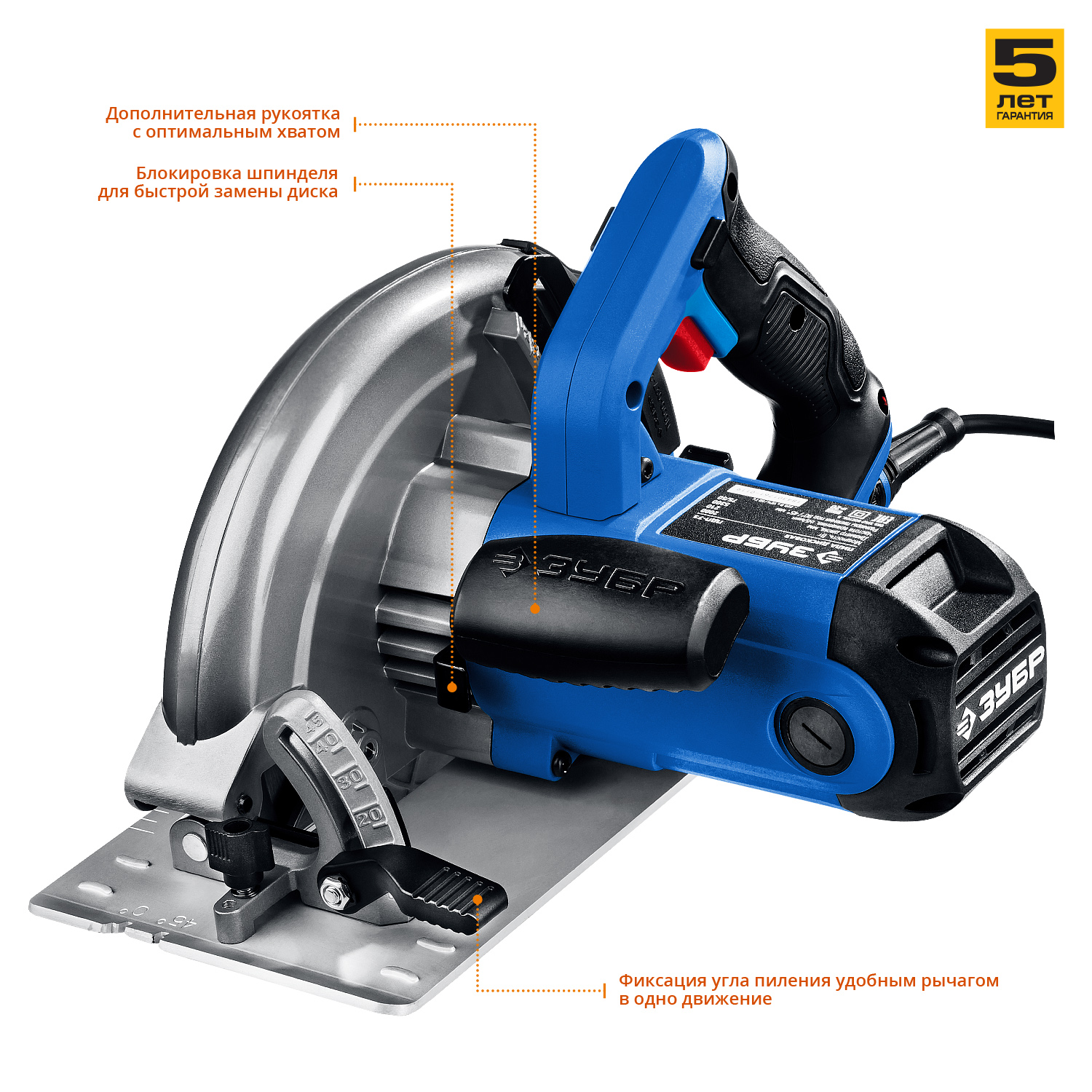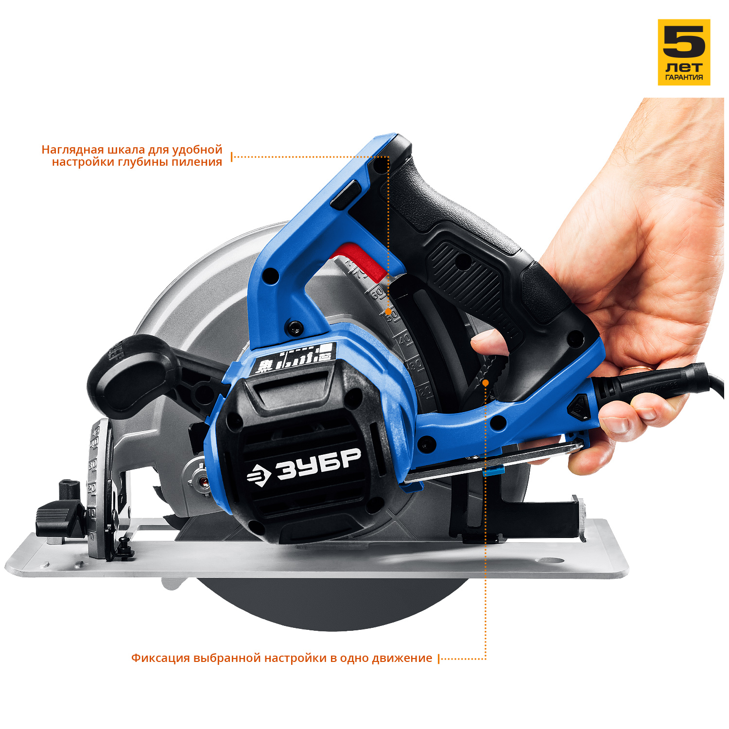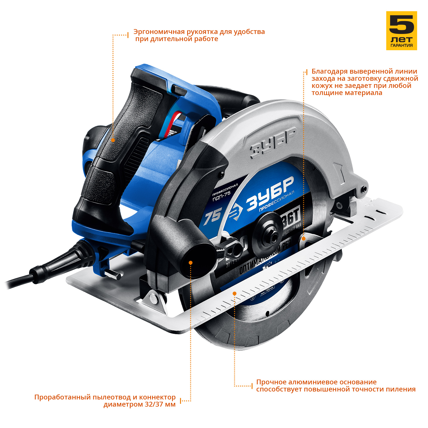 Циркулярная пила для всех видов распиловочных работ в серии профессионального инструмента ЗУБР. Максимальная глубина пиления 75 мм позволяет пилить все виды фанеры, любые листовые материалы, а также большинство типоразмеров досок и некоторые виды брусков. Жесткая конструкции обеспечивает точность пиления, плавный пуск устраняет начальный рывок, а удобные рычаги фиксации выбранных настроек и оптимальная эргономика рукояток помогают работать быстрее и комфортнее