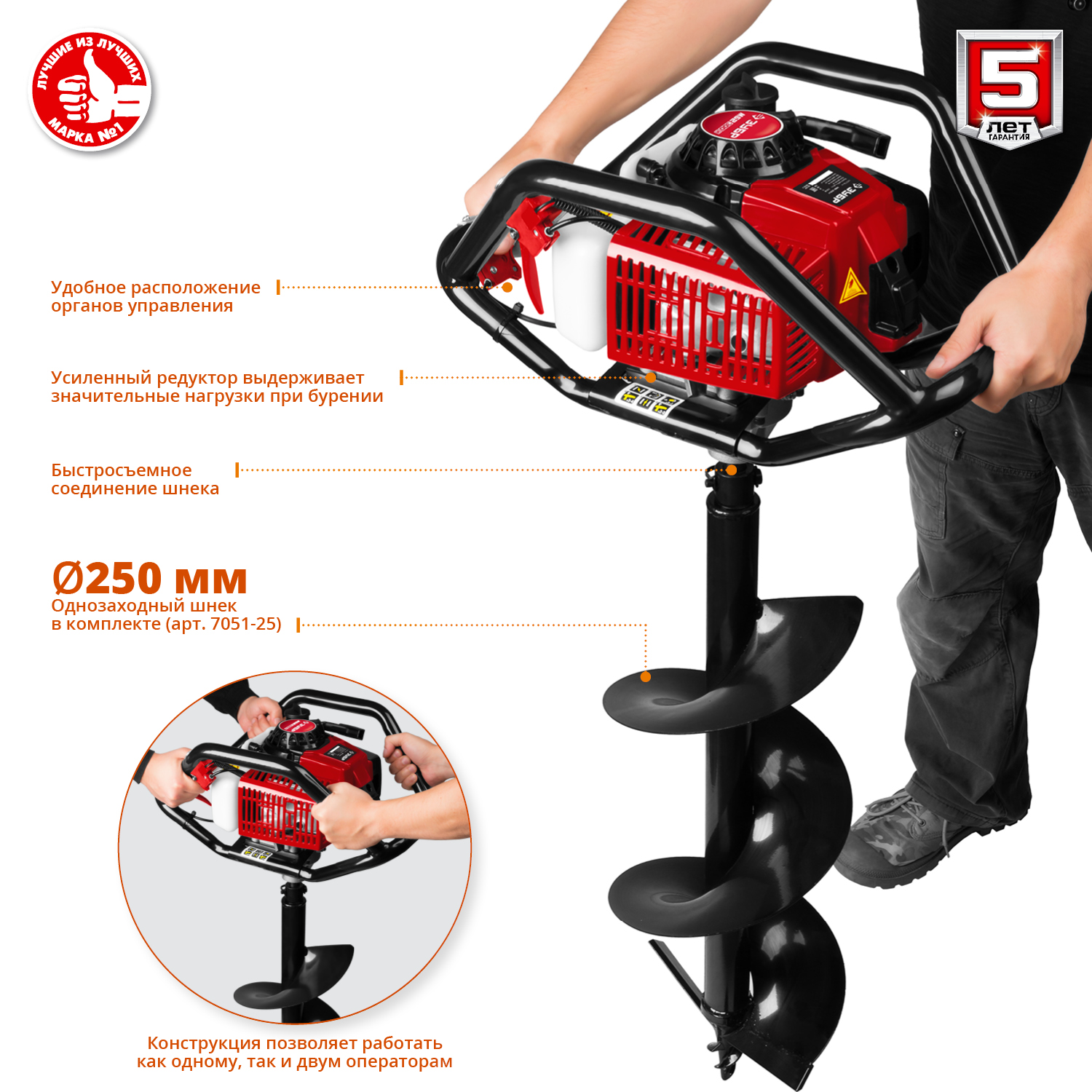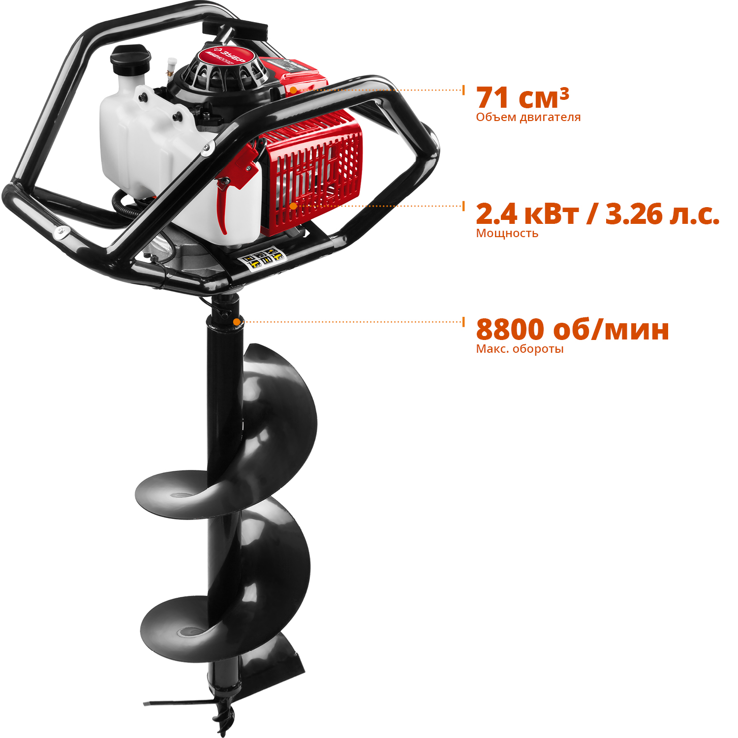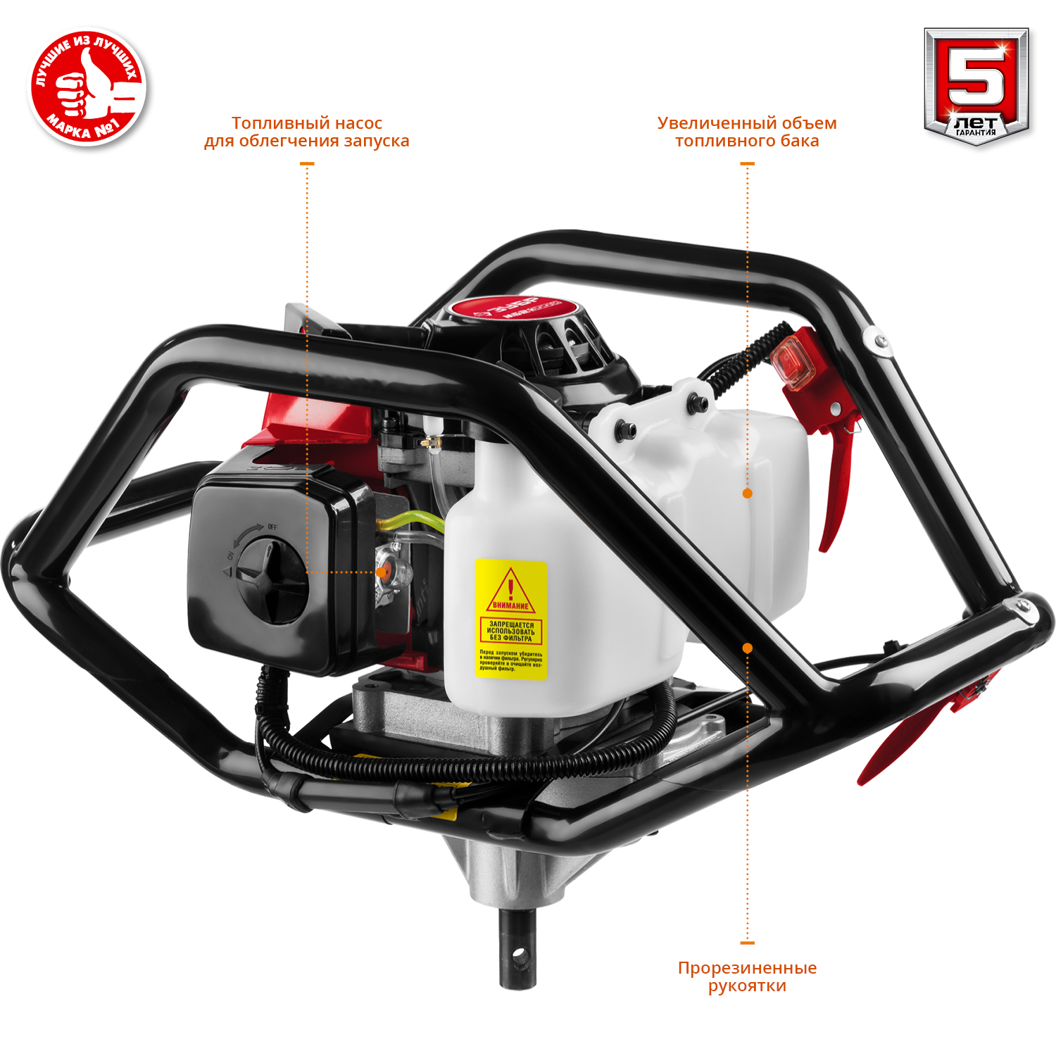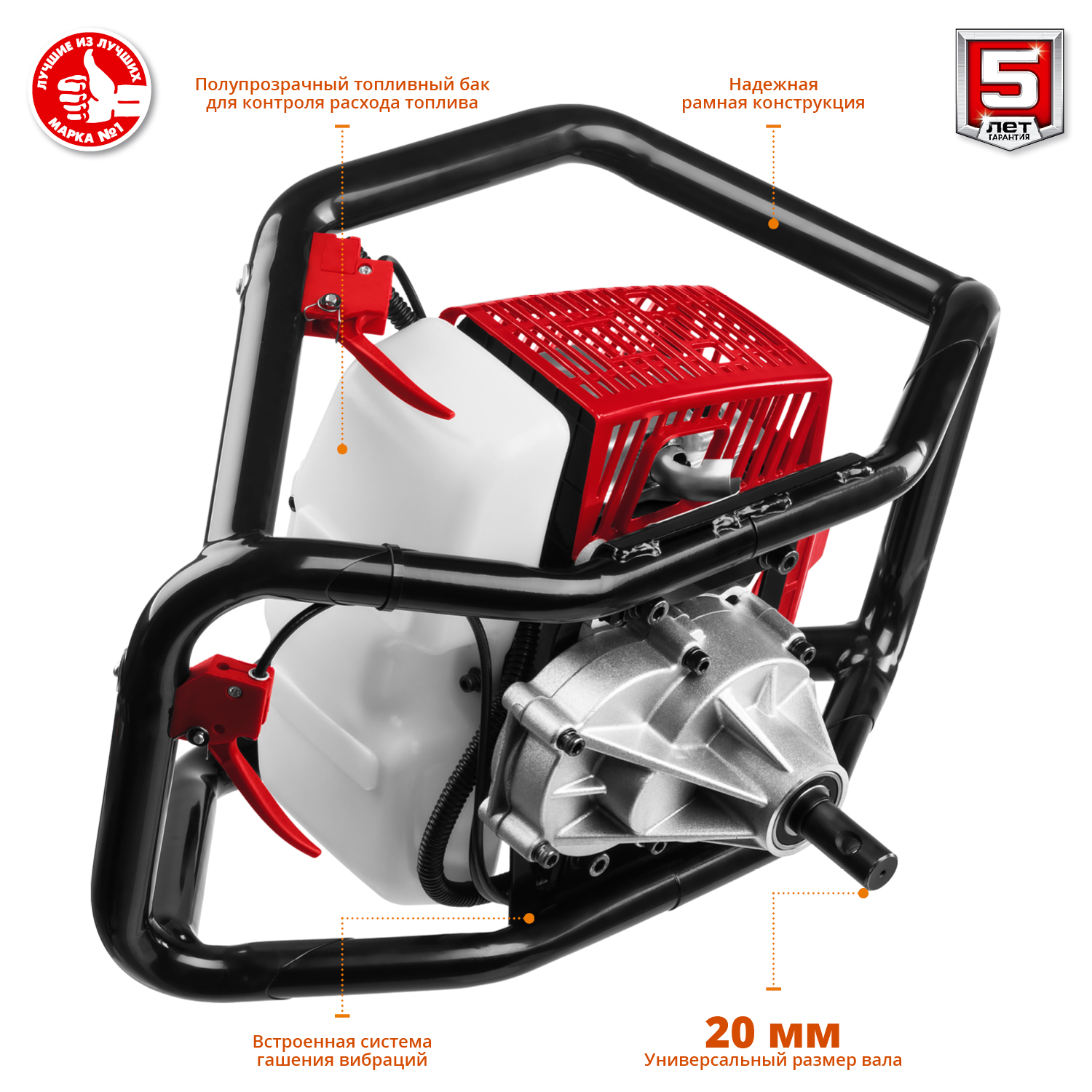 Мощный инструмент для бурения отверстий в мягких, твердых, мерзлых грунтах, а также во льду. Мощный 2-х тактный двигатель и универсальная конструкция рамы позволяют быстро и эффективно произвести необходимые работы по бурению. Конструкция рамы мотобура позволяет работать как одному, так и двум операторам, что повышает эффективность бурения, кроме того обеспечивает дополнительную сохранность двигателя при работе и транспортировке.