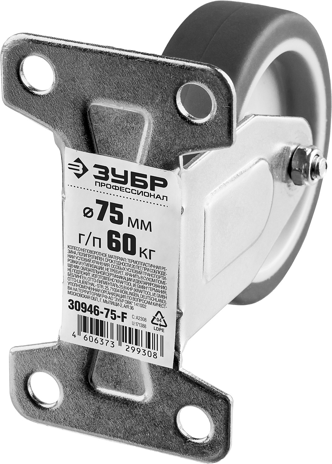 ЗУБР d 75 мм, г/п 60 кг, резина/полипропилен, термопластичное неповоротное колесо, Профессионал (30946-75-F)