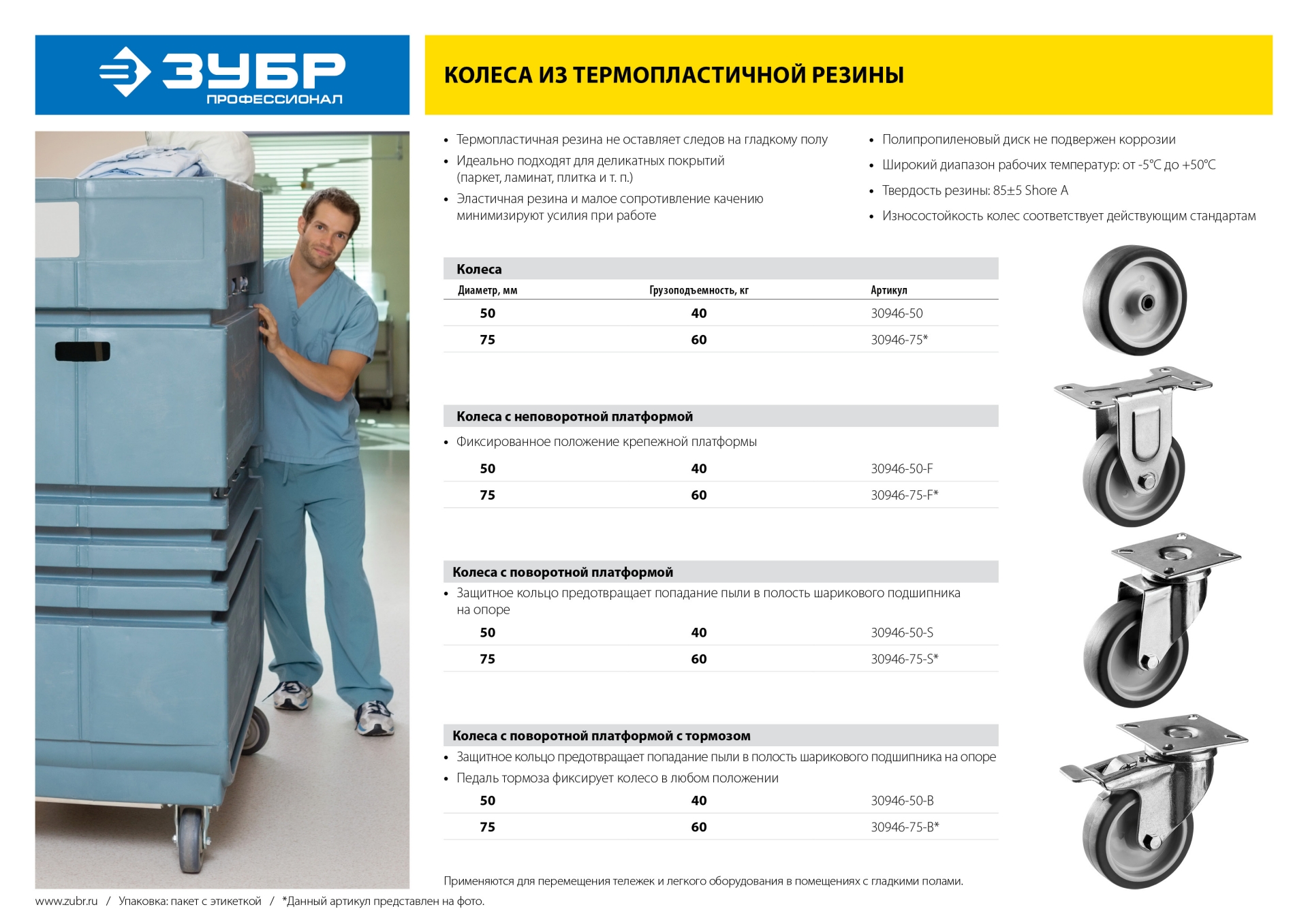 • Идеально подходят для применения внутри помещений на гладких полах. Эластичная резина и малое сопротивление качению требуют приложения минимальных усилий при работе.