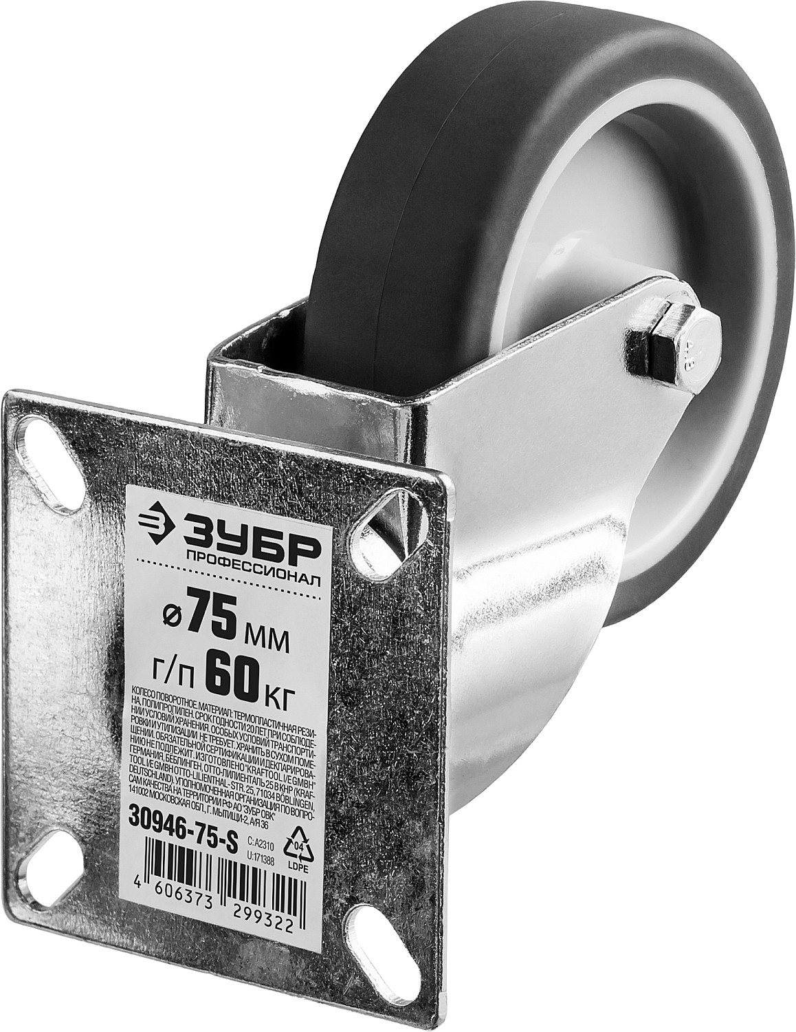 ЗУБР d 75 мм, г/п 60 кг, резина/полипропилен, термопластичное поворотное колесо, Профессионал (30946-75-S)