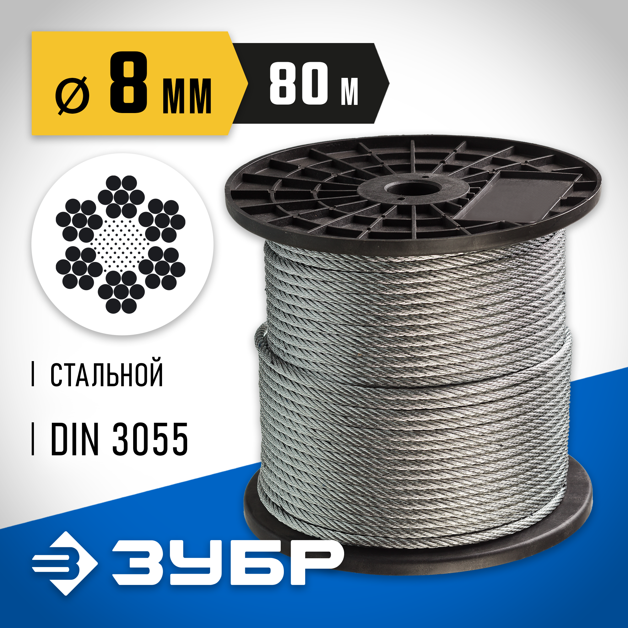 ЗУБР DIN 3055, свивка 6 x 7 + FC, 8 мм, L 80 м, стальной трос, Профессионал (4-304110-08)