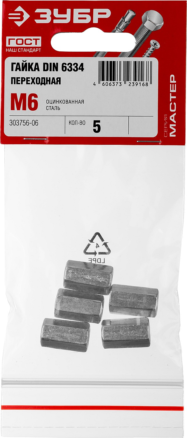 ЗУБР DIN 6334, M6, цинк, 5 шт, переходная гайка (303756-06)