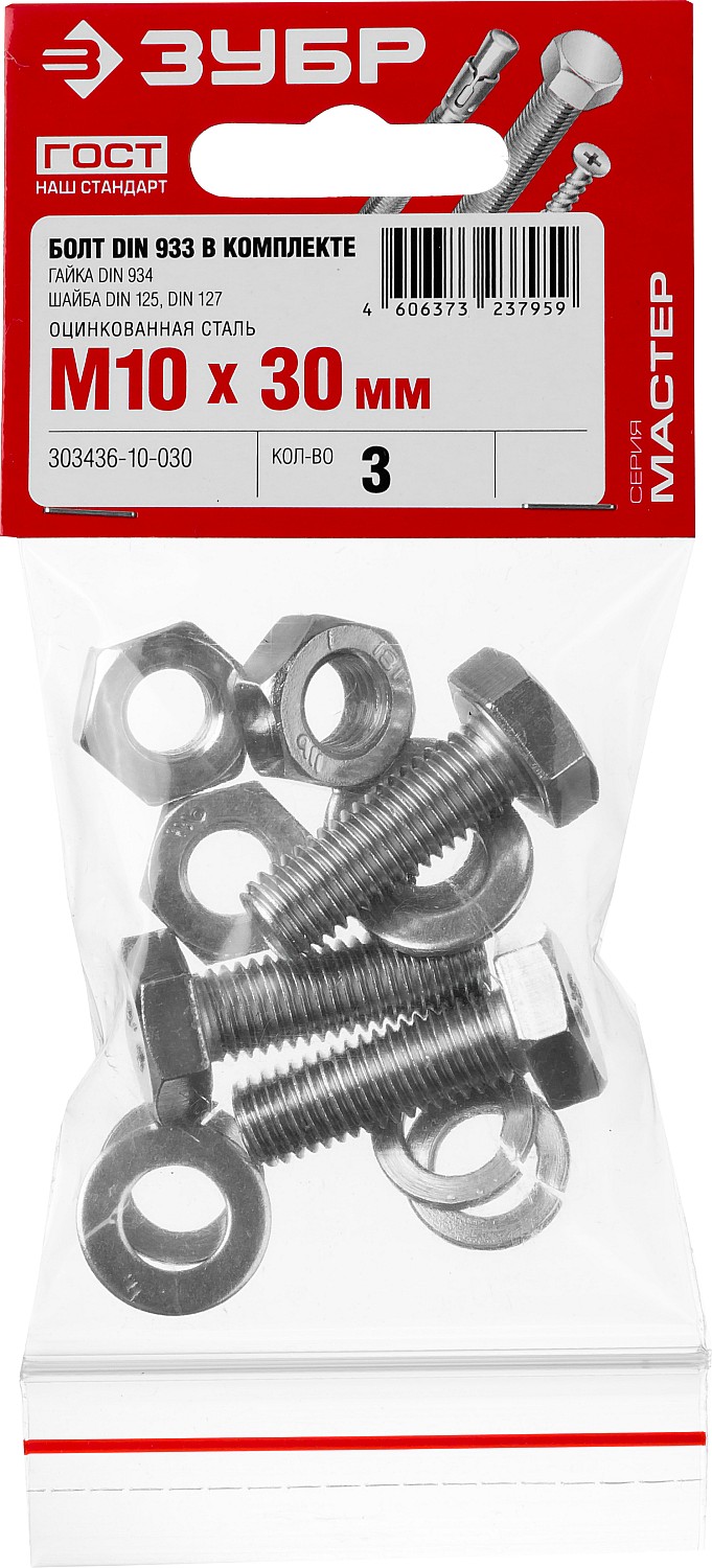 ЗУБР DIN 933, M10 х 30 мм, цинк, 3 шт, болт с гайкой и шайбами (303436-10-030)