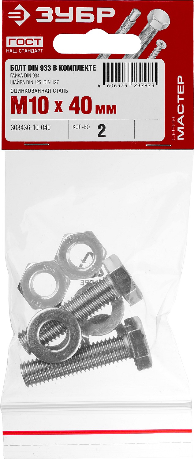 ЗУБР DIN 933, M10 х 40 мм, цинк, 2 шт, болт с гайкой и шайбами (303436-10-040)