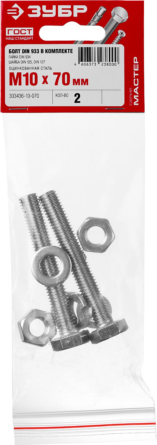 ЗУБР DIN 933, M10 х 70 мм, цинк, 2 шт, болт с гайкой и шайбами (303436-10-070)