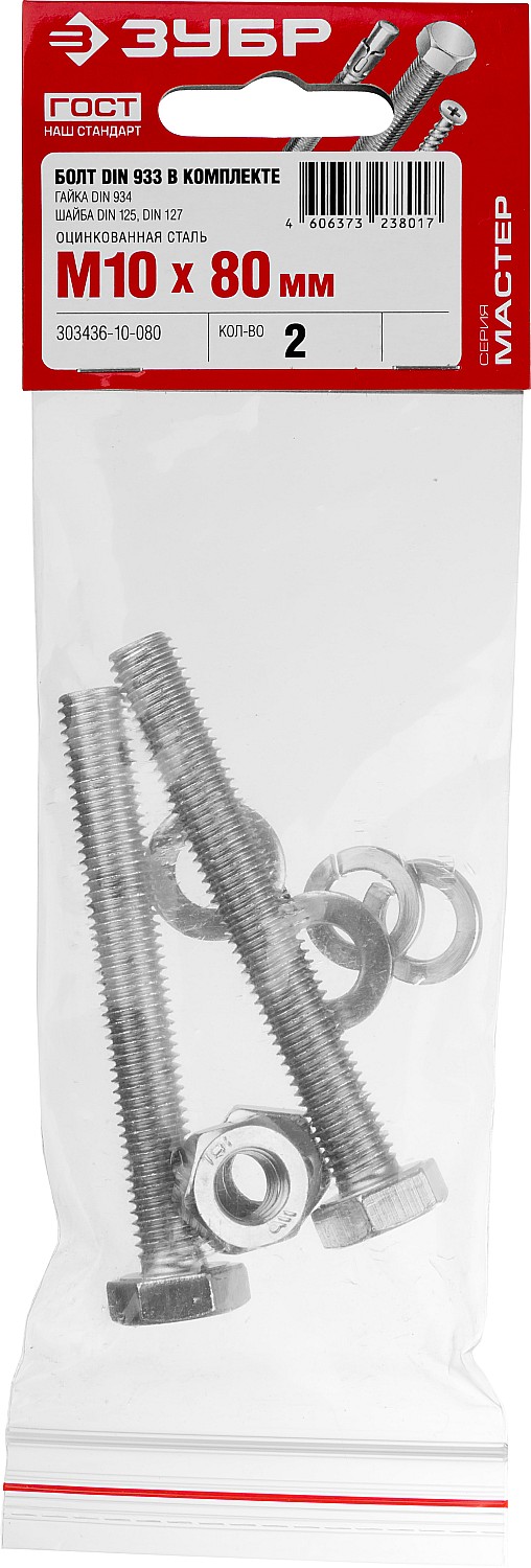 ЗУБР DIN 933, M10 х 80 мм, цинк, 2 шт, болт с гайкой и шайбами (303436-10-080)