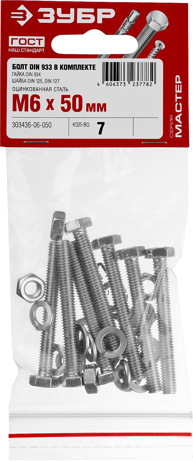 ЗУБР DIN 933, M6 х 50 мм, цинк, 7 шт, болт с гайкой и шайбами (303436-06-050)