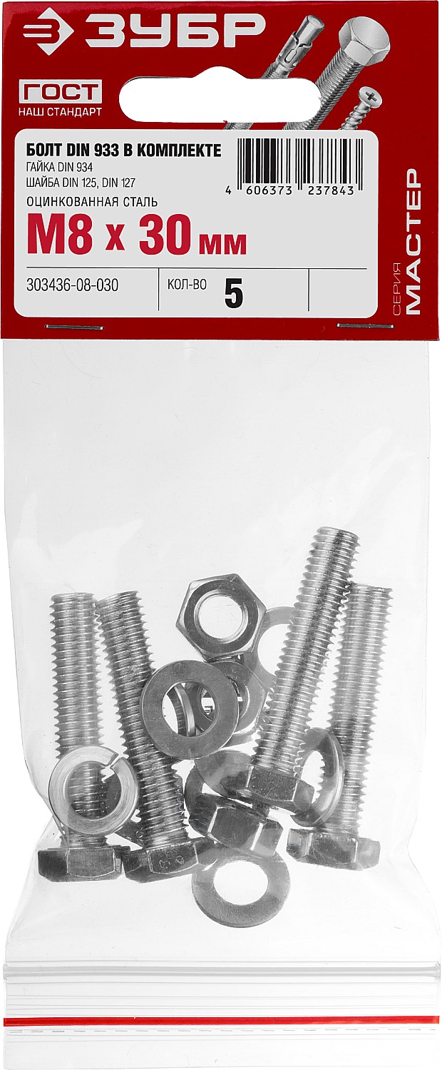 ЗУБР DIN 933, M8 х 30 мм, цинк, 5 шт, болт с гайкой и шайбами (303436-08-030)