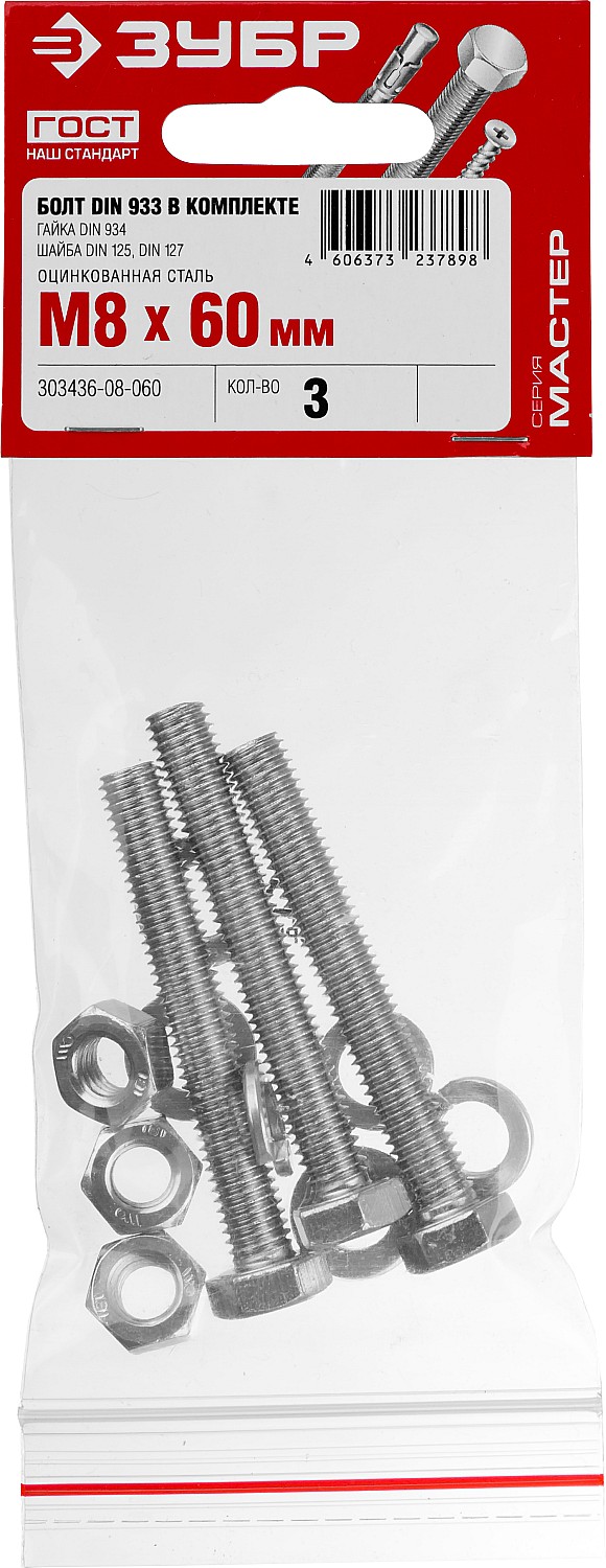 ЗУБР DIN 933, M8 х 60 мм, цинк, 3 шт, болт с гайкой и шайбами (303436-08-060)