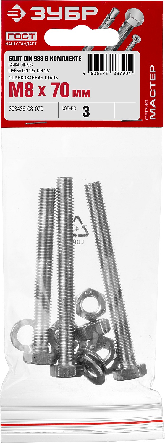 ЗУБР DIN 933, M8 х 70 мм, цинк, 3 шт, болт с гайкой и шайбами (303436-08-070)