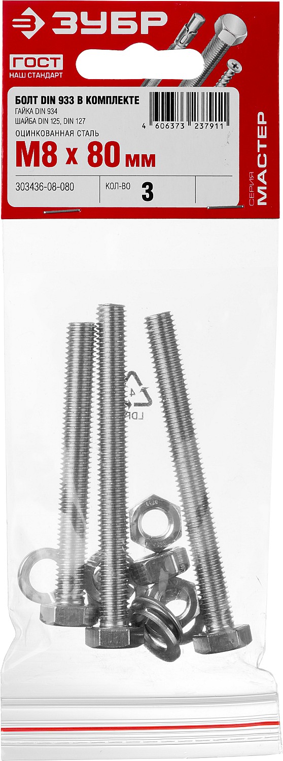 ЗУБР DIN 933, M8 х 80 мм, цинк, 3 шт, болт с гайкой и шайбами (303436-08-080)