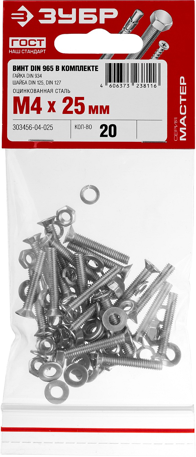 ЗУБР DIN 965, M4 х 25 мм, цинк, 20 шт, винт с гайкой и шайбами (303456-04-025)