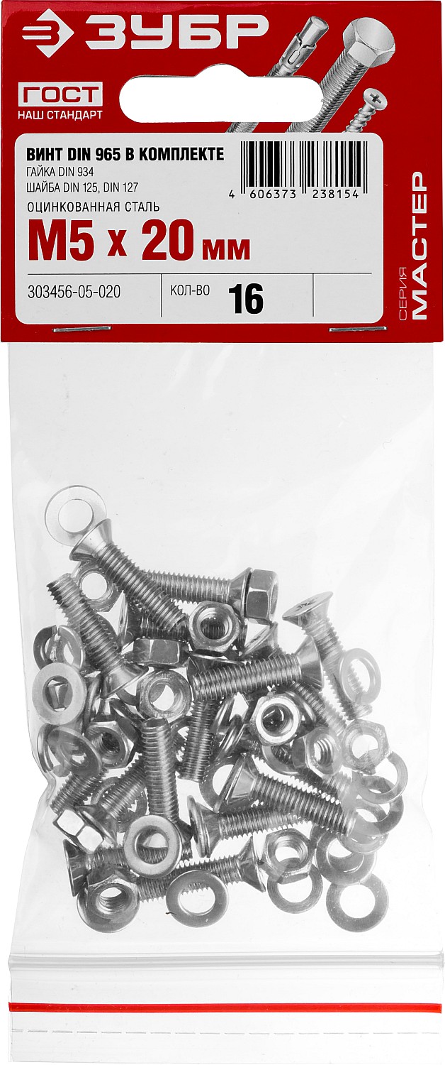 ЗУБР DIN 965, M5 х 20 мм, цинк, 16 шт, винт с гайкой и шайбами (303456-05-020)