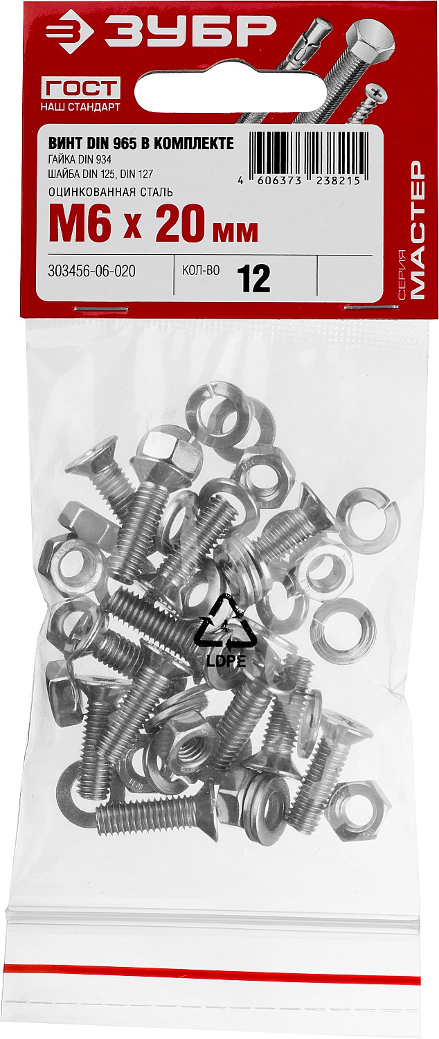 ЗУБР DIN 965, M6 х 20 мм, цинк, 12 шт, винт с гайкой и шайбами (303456-06-020)