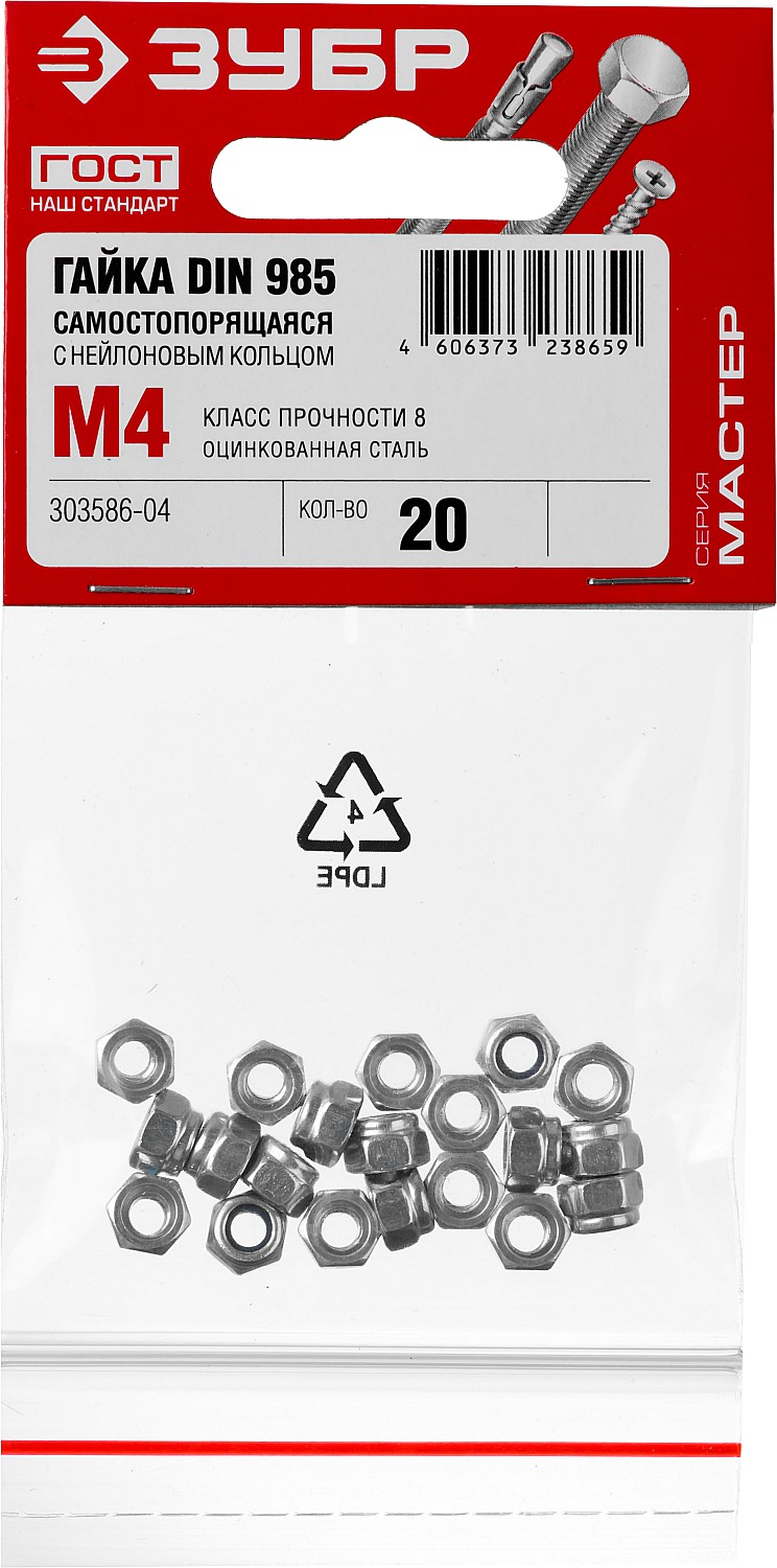 ЗУБР DIN 985, кл. пр. 6, M4, цинк, 20 шт, самостопорящаяся гайка с нейлоновым кольцом (303586-04)