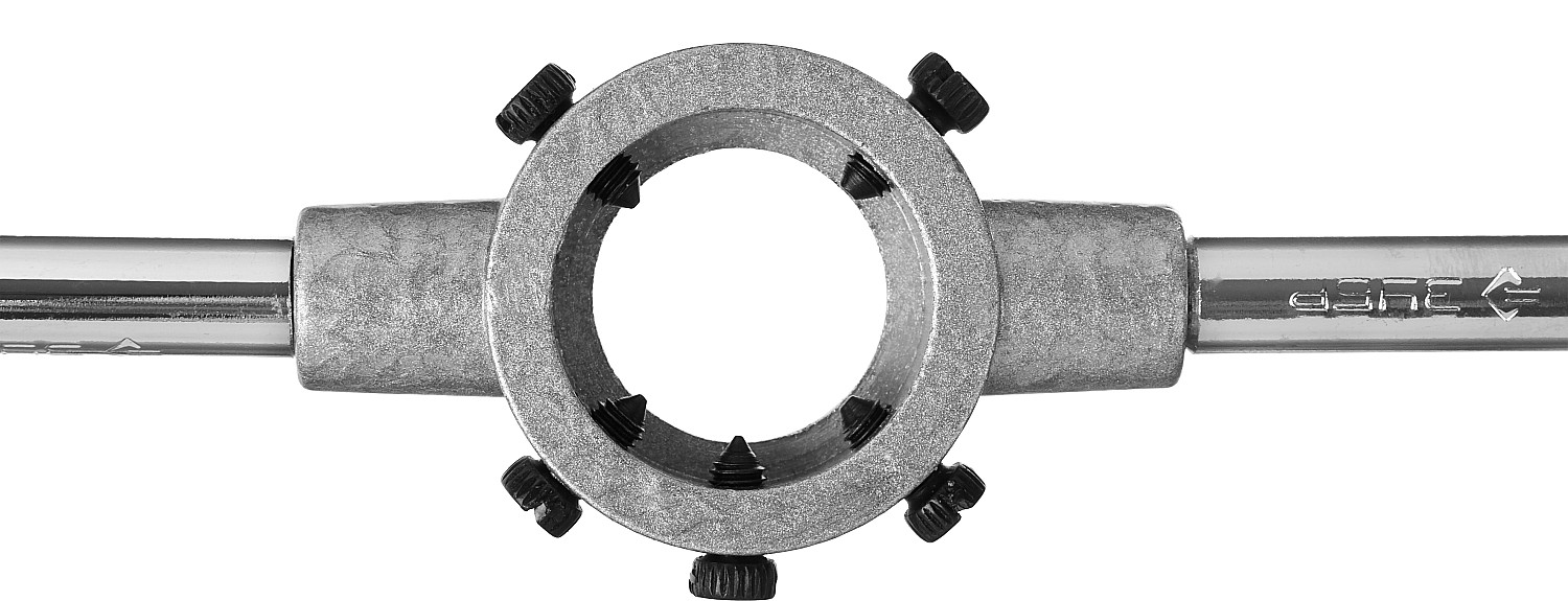 - Плашкодержатель оснащен стопорными винтами для фиксации плашки