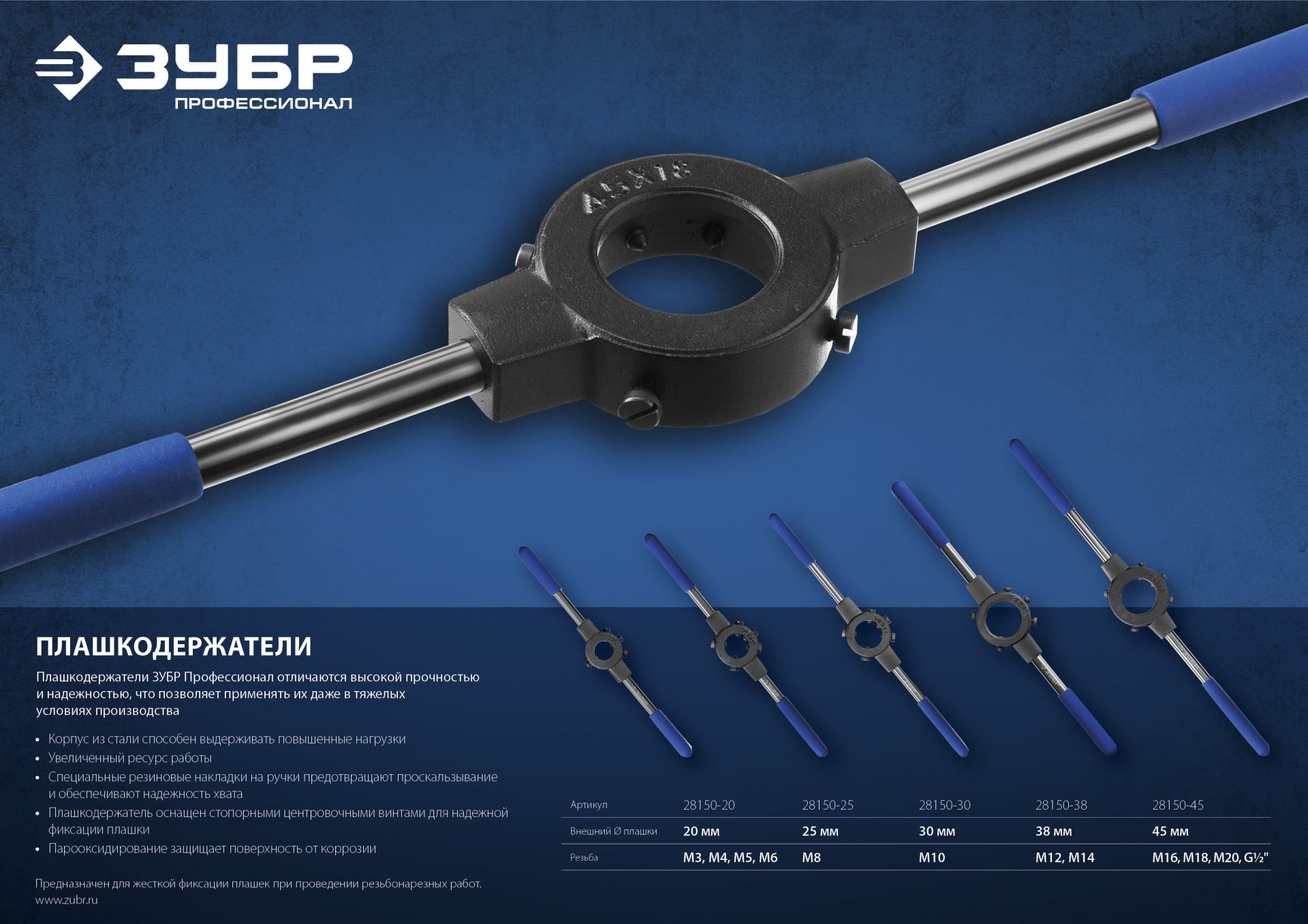 Плашкодержатели ЗУБР ПРОФЕССИОНАЛ отличаются высокой прочностью, что позволяет применять их даже в тяжелых условиях производства